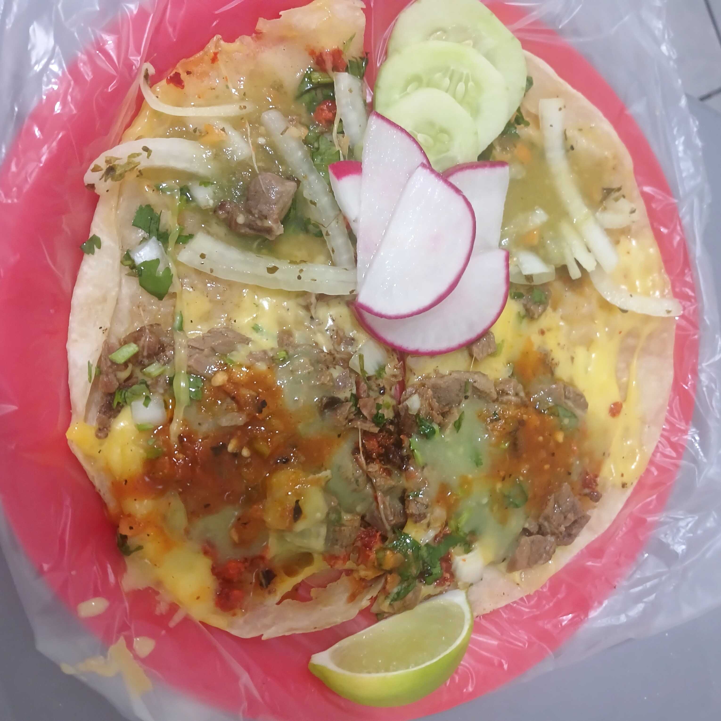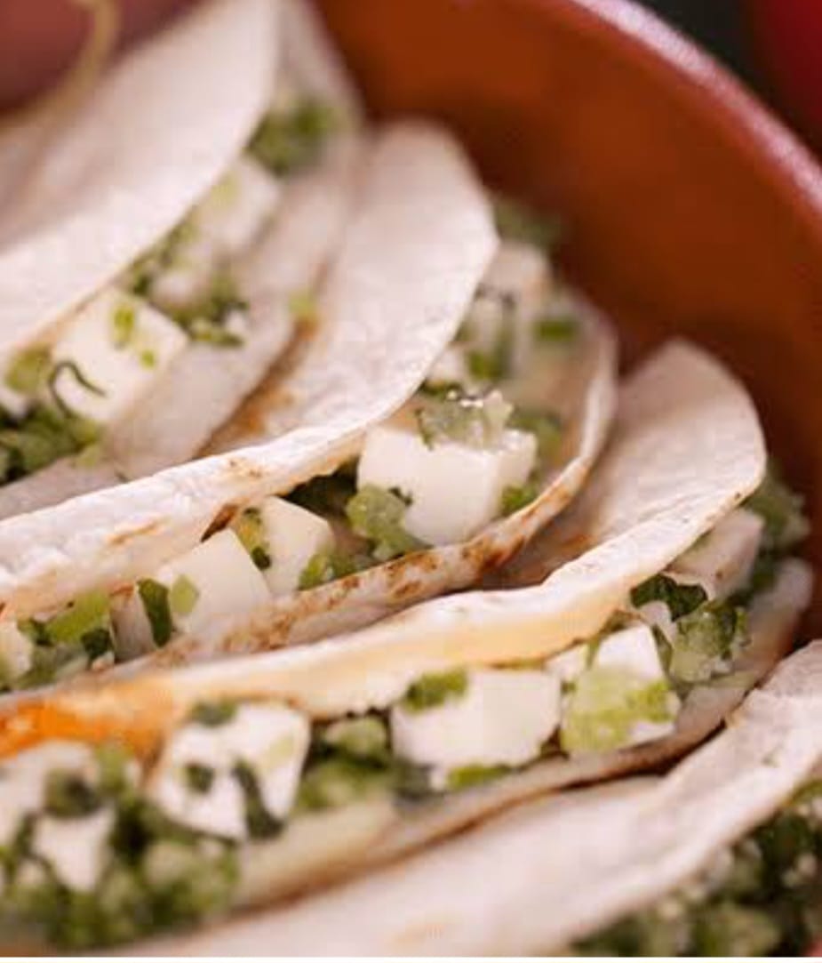 Panela Fundida entre 2 Tortillas, Acompañados de Cilantro y Cebolla
