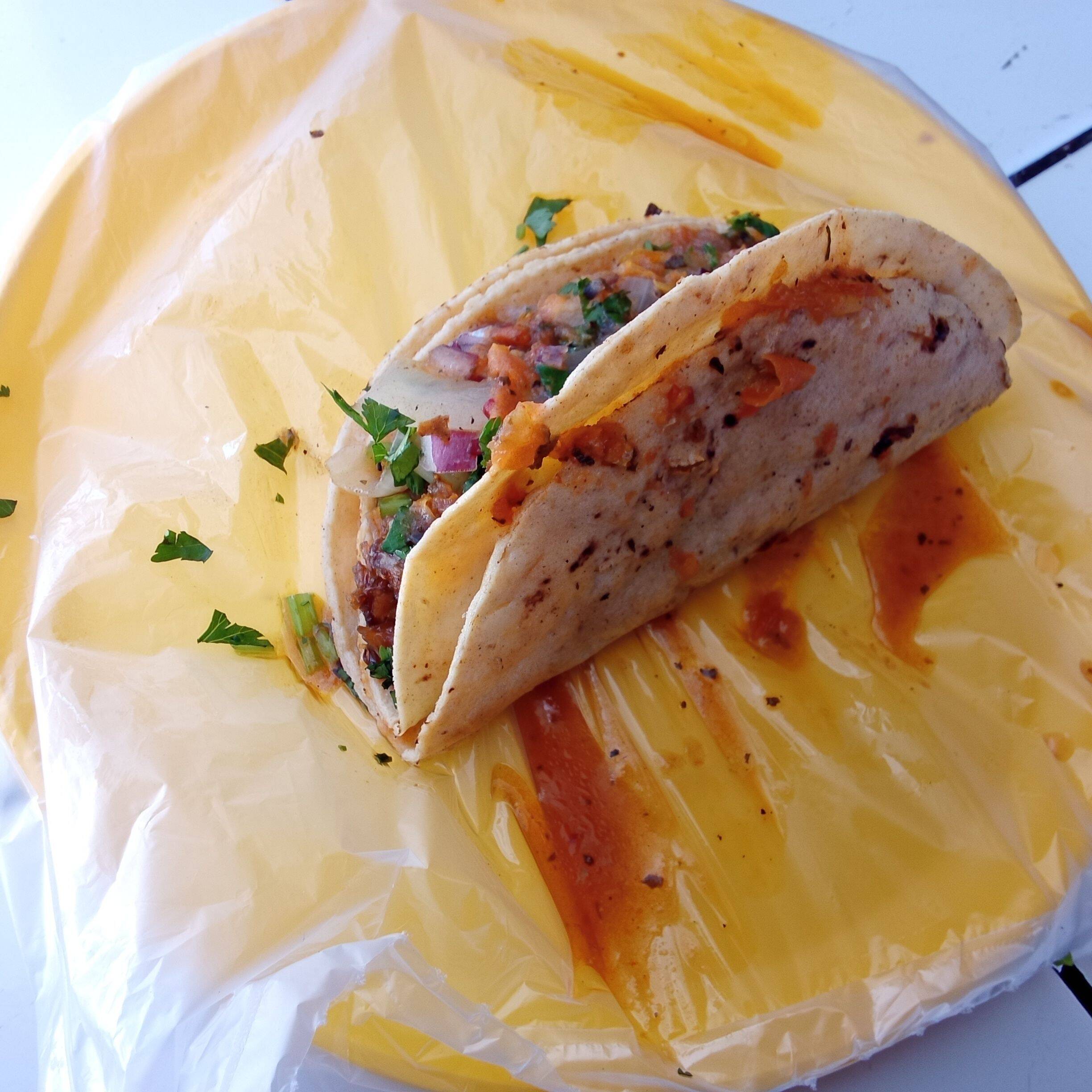 Taco por unidad, tortilla de maíz doble dorada, queso y carne de res.
