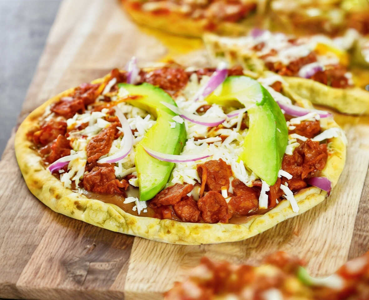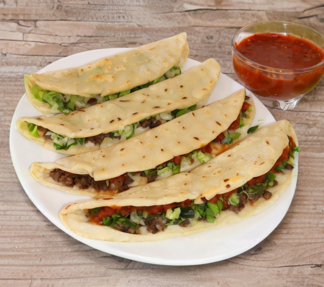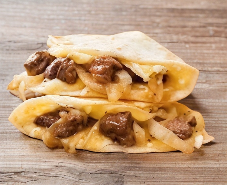 tortilla dorada de maíz con queso fundido y carne adobada asada al carbón
