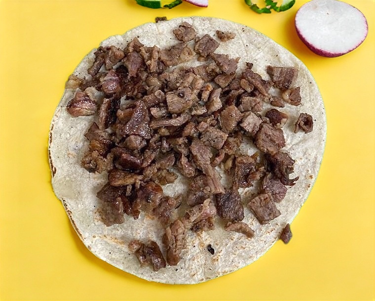 tortilla grande de harina, con queso fundido y una buena porción de carne asada
