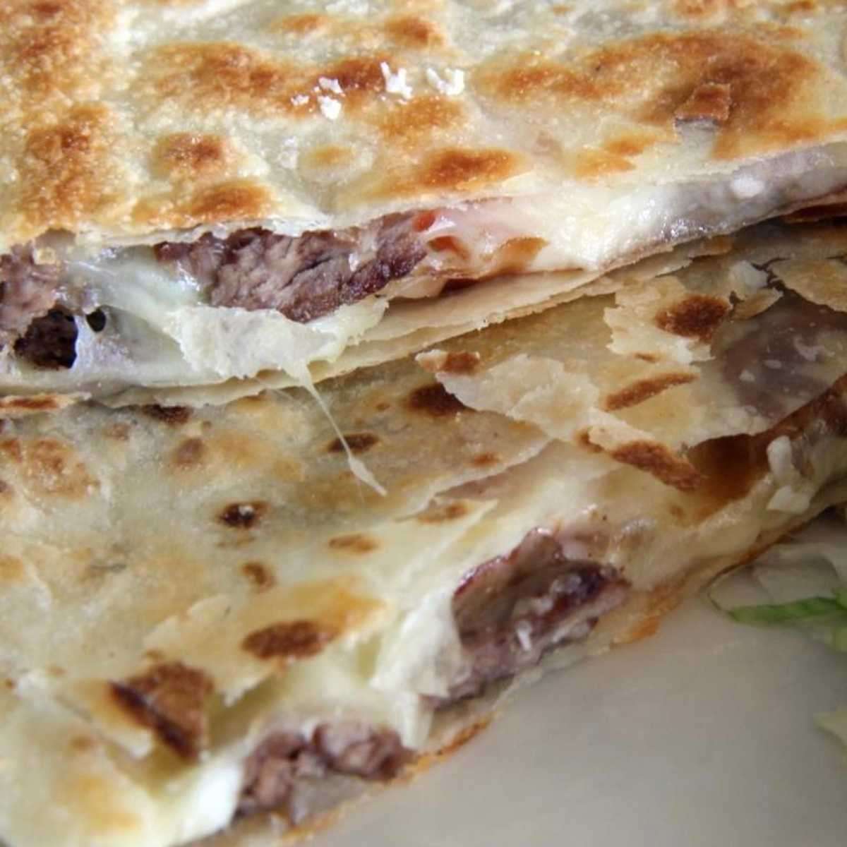 quesadilla de tortilla de maíz con queso fundido y carne adobada asada al carbón