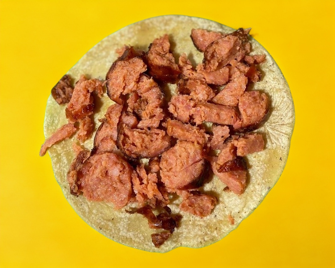 Taco de tortilla de maíz con un chorizo corona asado al carbón y queso fundido en el centro mas una porción de carne asada