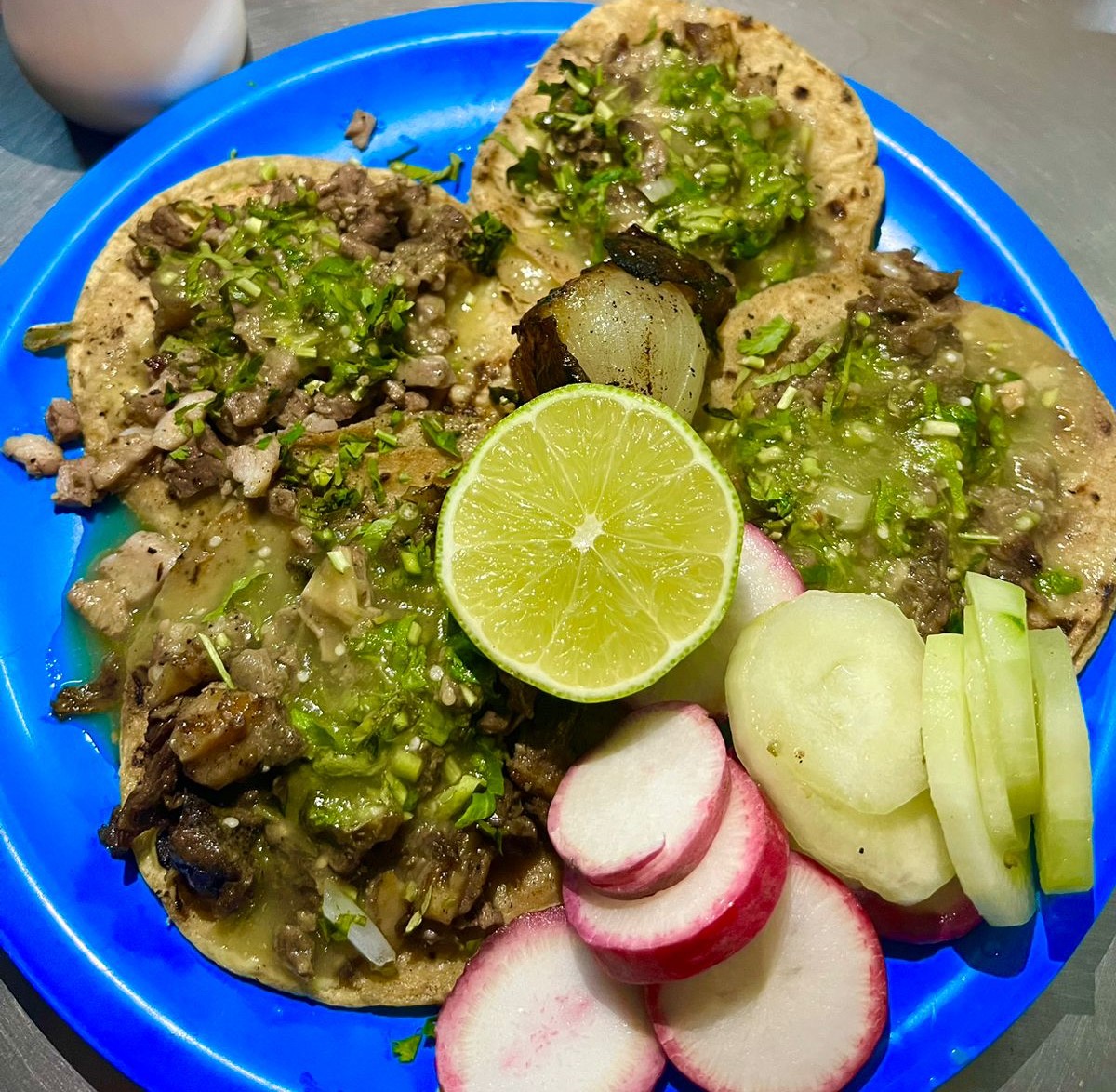 Este es un platillo personal, contiene tacos de maíz a elección del cliente, carne de res, verduras ( cebolla, cilantro), limón, salsa de tomate y chile serrano