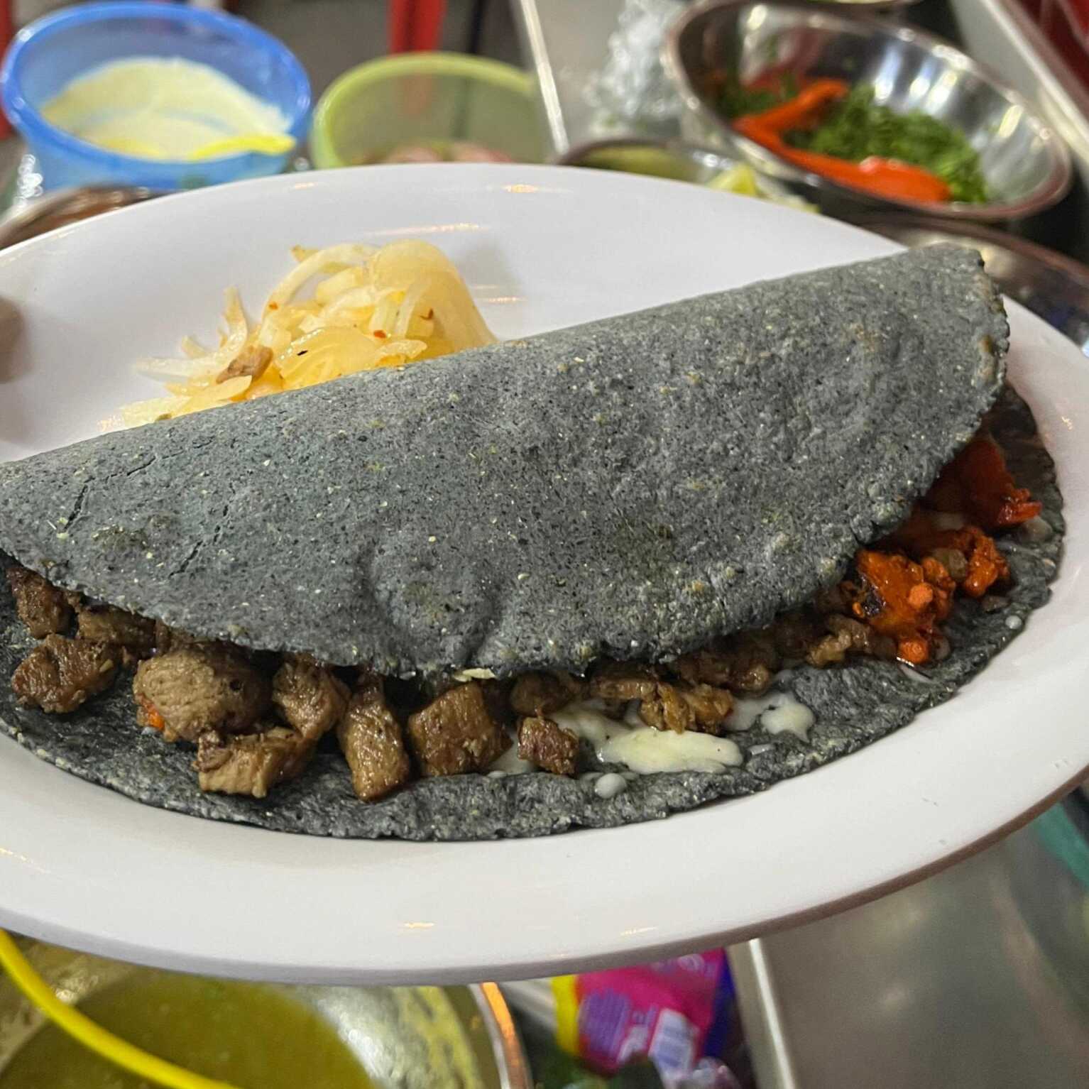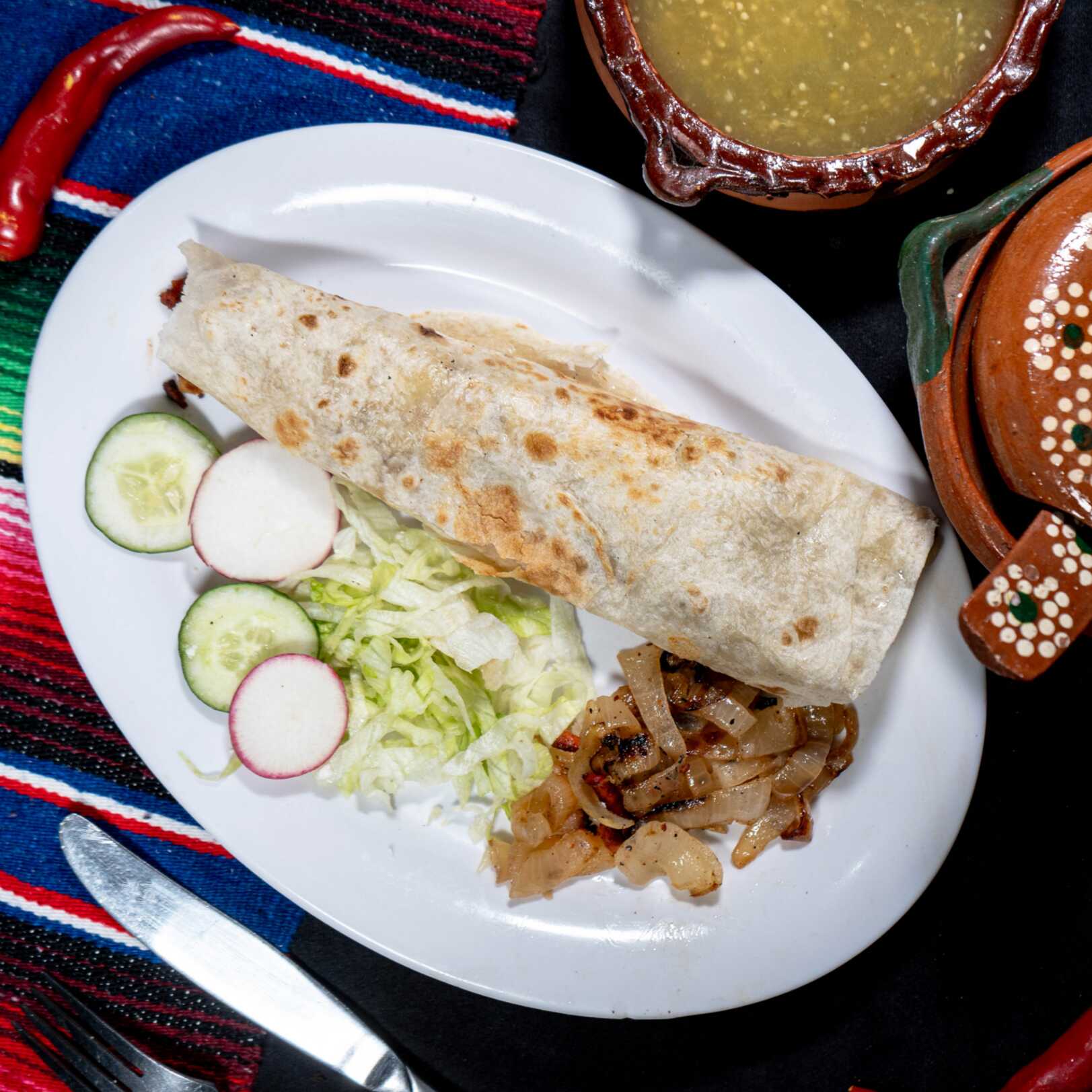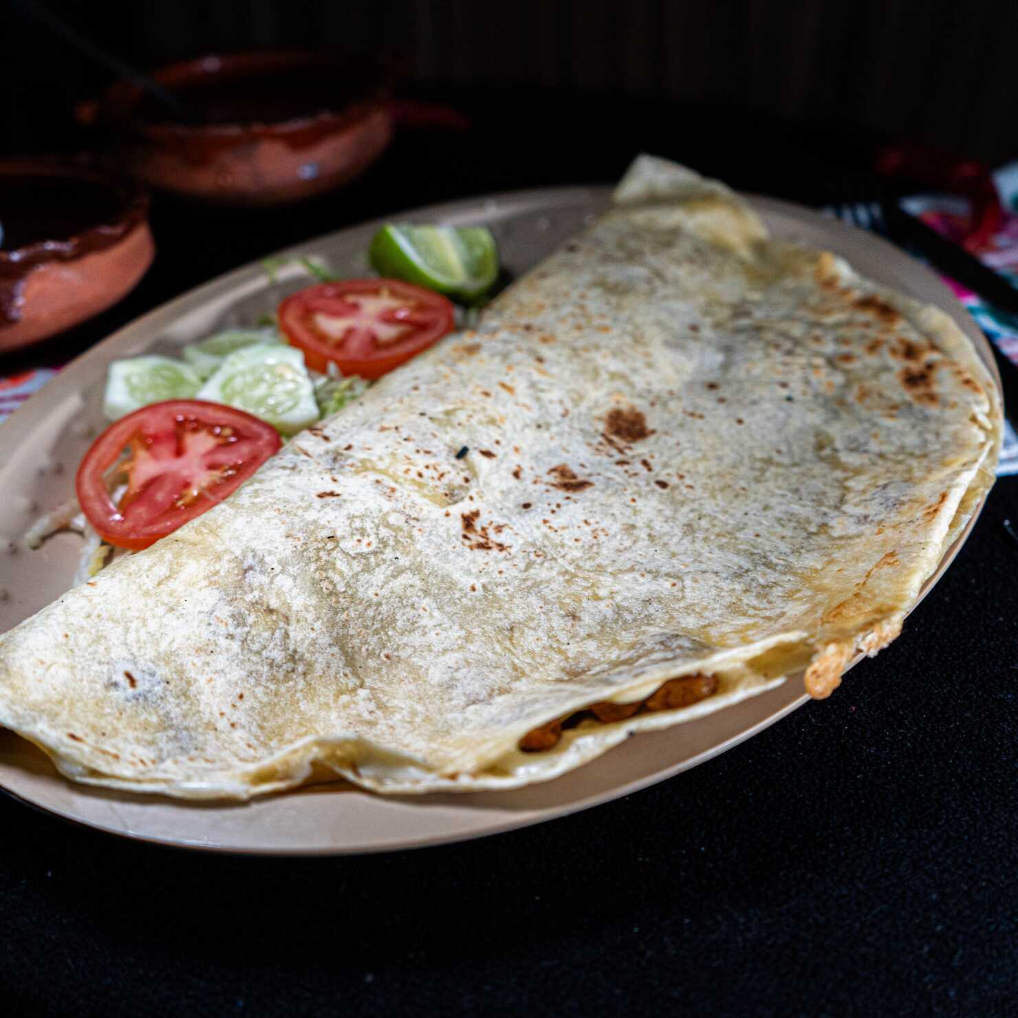 Tortilla de harina con diámetro de 50 cm, integrada con frijoles, queso de fundir, carne de tu elección. Incluye salsas y verduras.