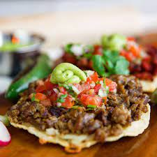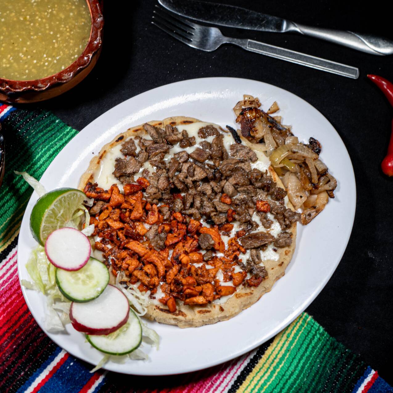 Hecha de Maíz de un diámetro de 25cm, preparada con frijoles, crema, queso Cotija y carne de su elección. Incluye verdura y salsas.
