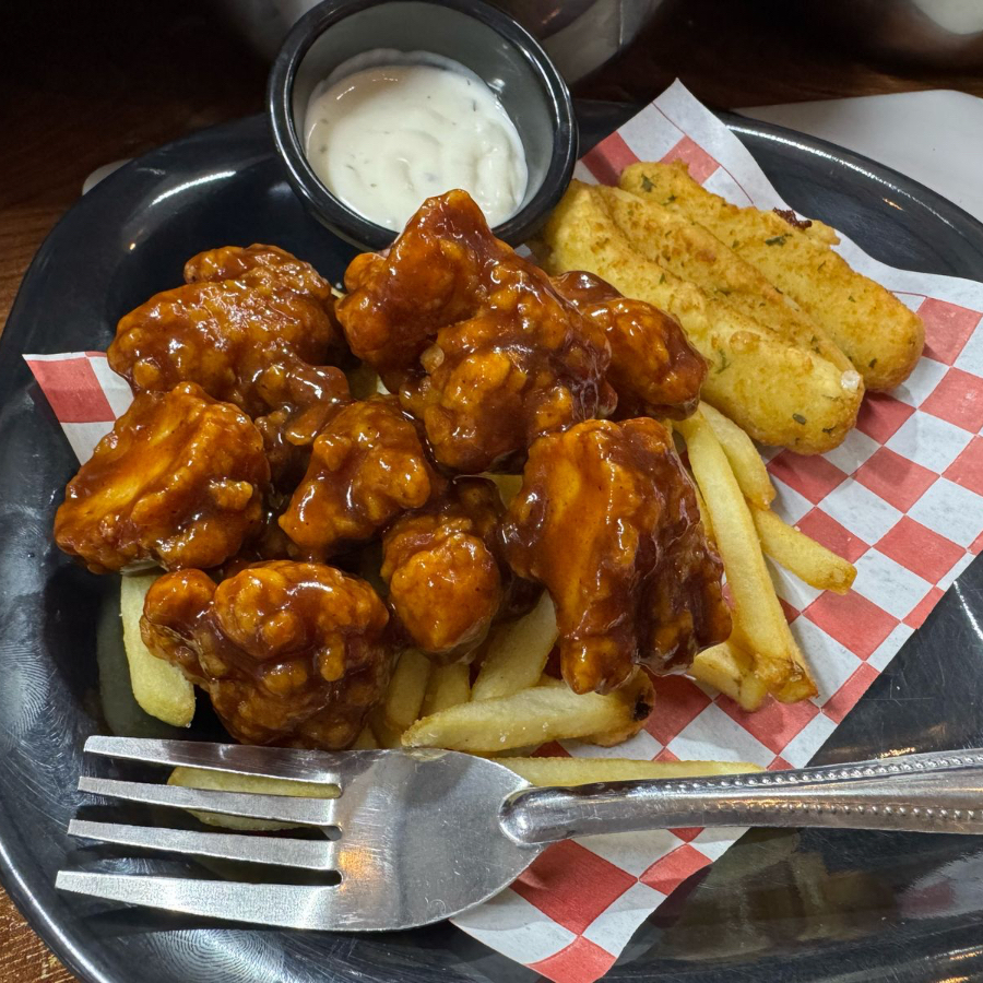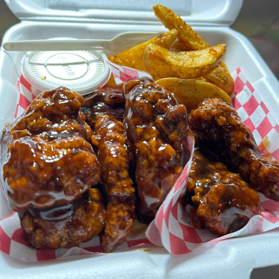 Papas de tu elección acompañas de Boneless baños en tu salsa favorita y porción de dedos de queso.