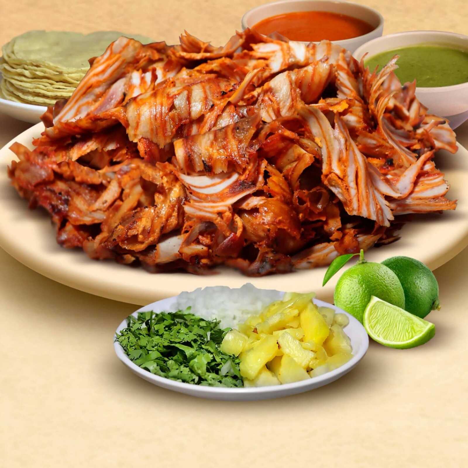 Orden preparada con Carne al Pastor, queso de fundir, Incluye Verduras, Salsas y Tortillas.