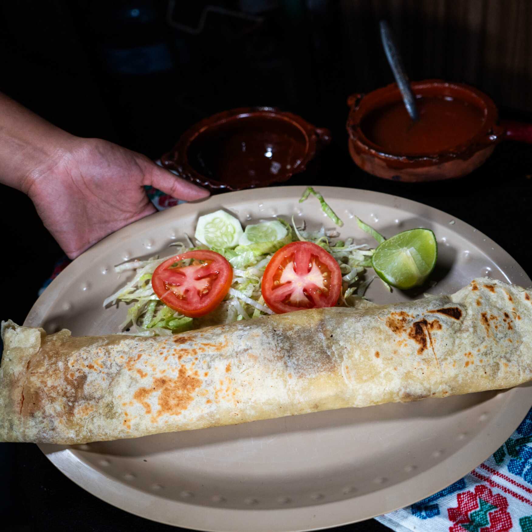 Tortilla hecha a mano con un diámetro de 25 cm, Queso de Fundir, Carne de su elección. Incluye Salsas y Verdura.