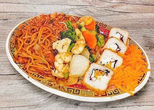 Porción de arroz/espaguetti + 1 chun kun phila + 1 guiso + 4 pzas de sushi de camarón
