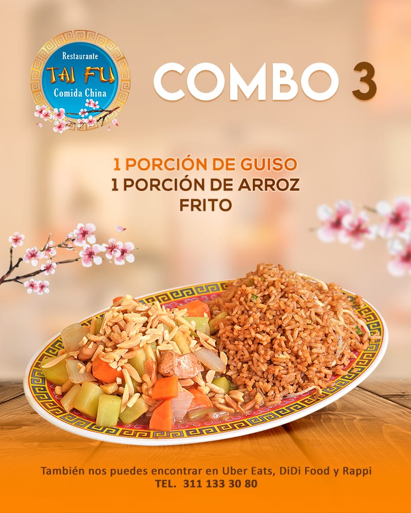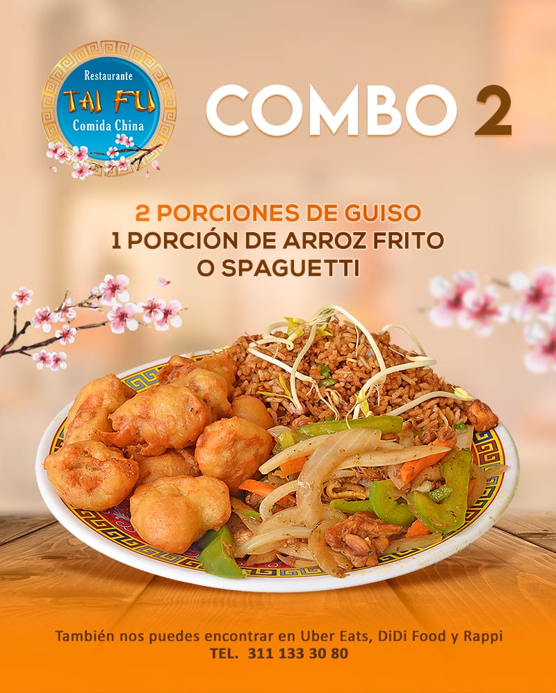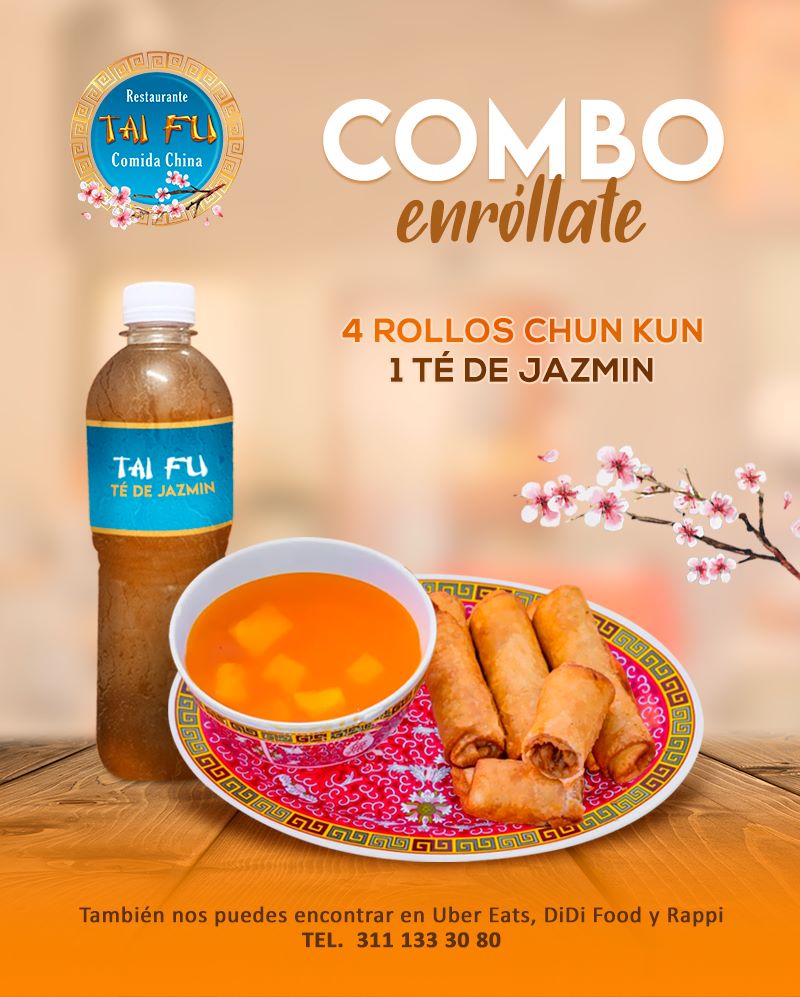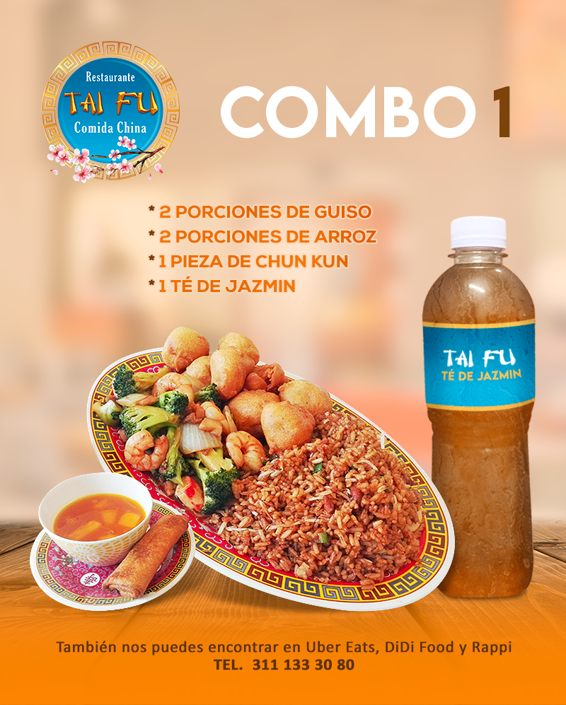 Arma tu combinación perfecta, elige 2 porciones de guiso, 2 guarnición, 1 chun kun rollo primavera y una bebida de 500 ml.