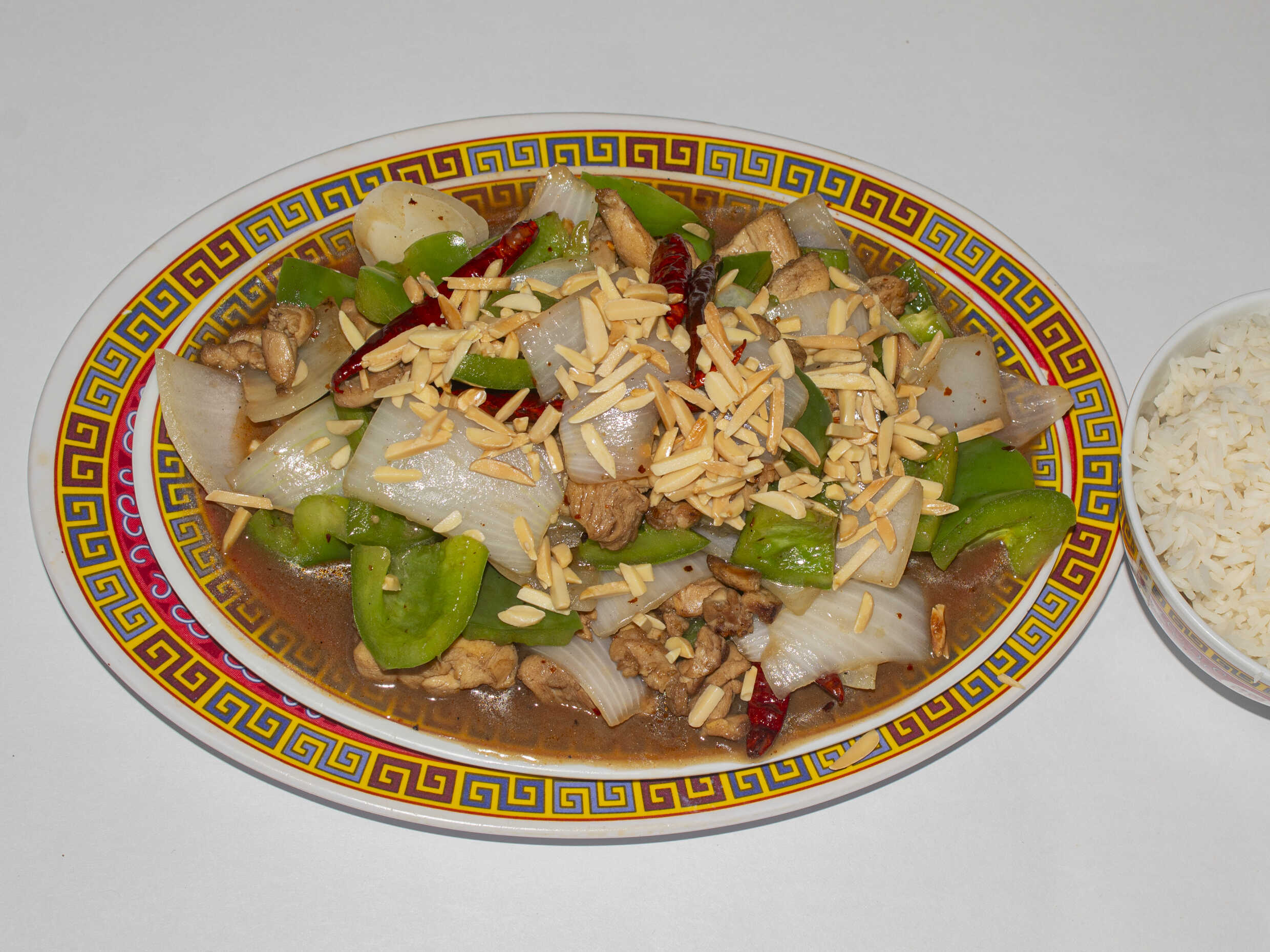 Chile morrón, almendra, pollo, cebolla, chile seco.