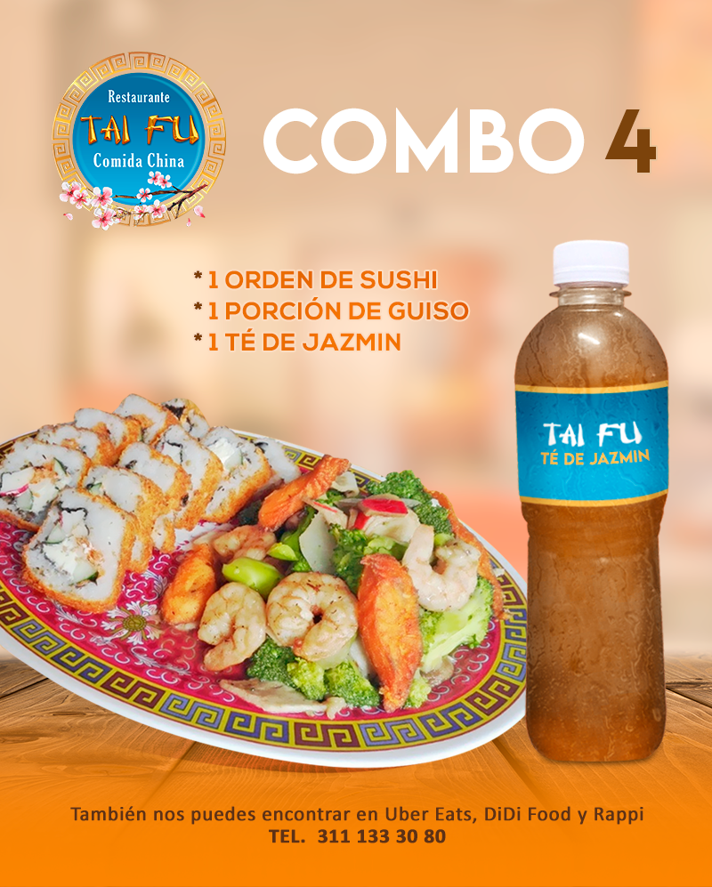 1 Orden de sushi con camarón, 1 porción de guiso y ½ L de té jazmín.