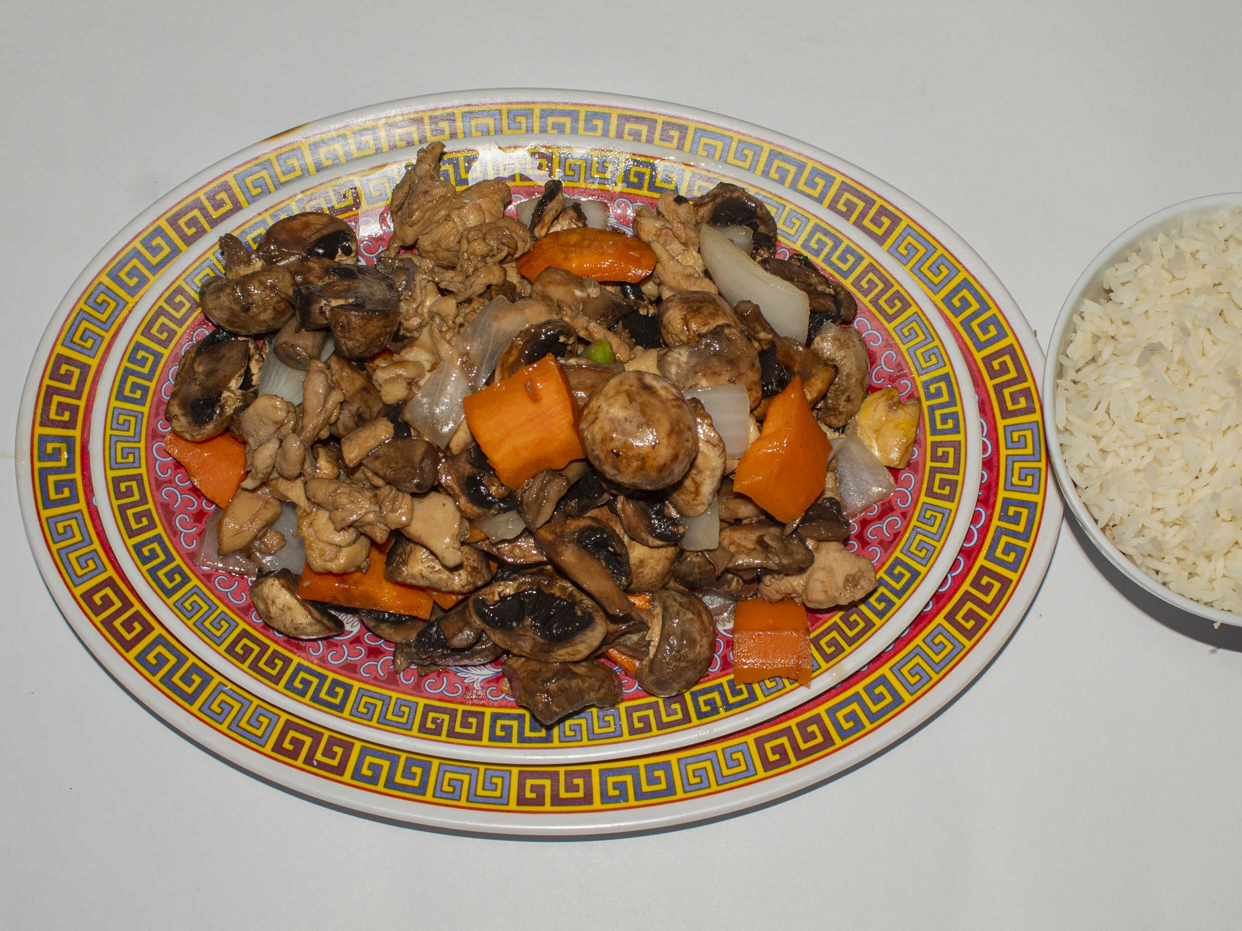 Champiñones, pollo, zanahoria, cebolla.