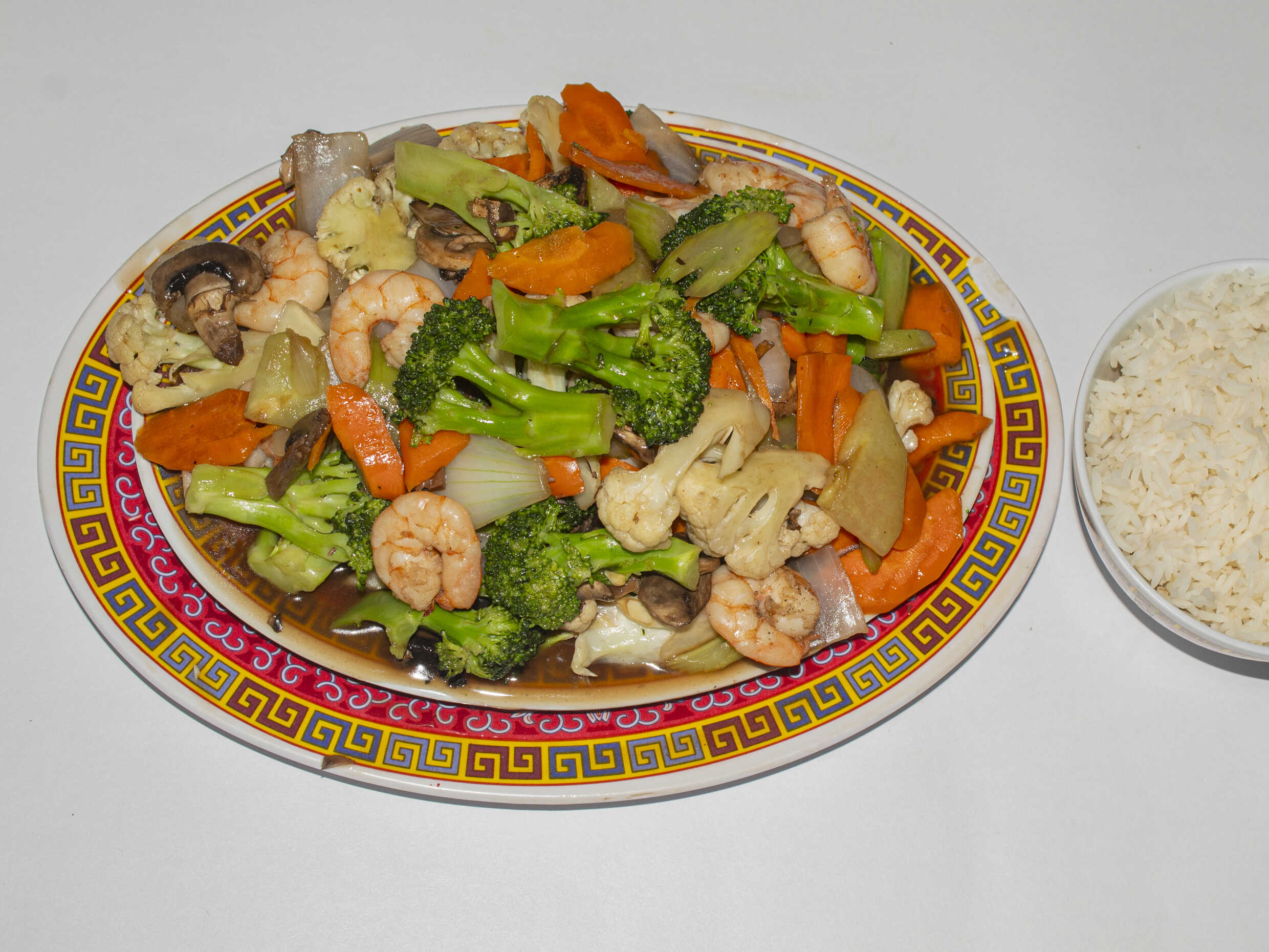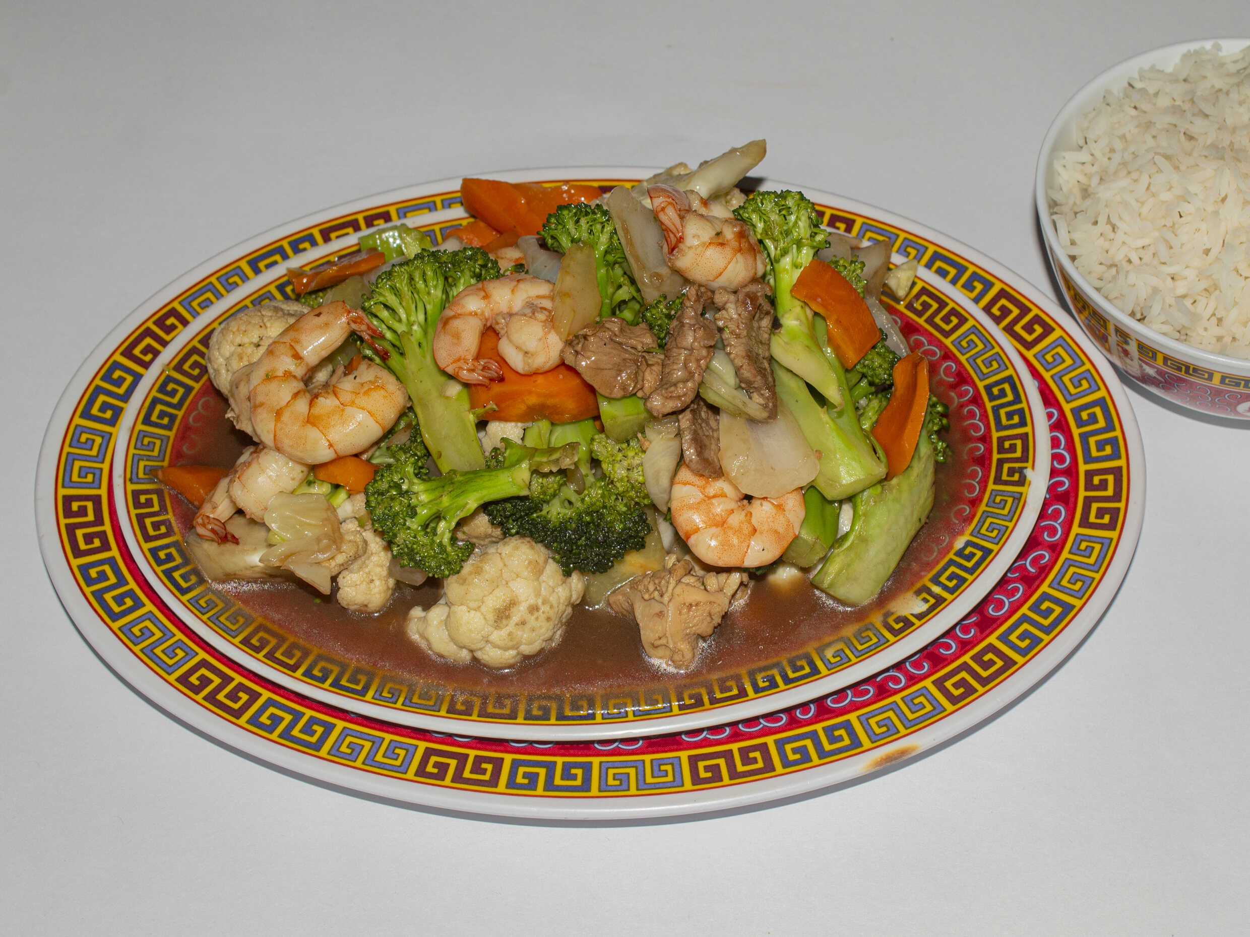Combinación de verduras, pollo, res y camarón.