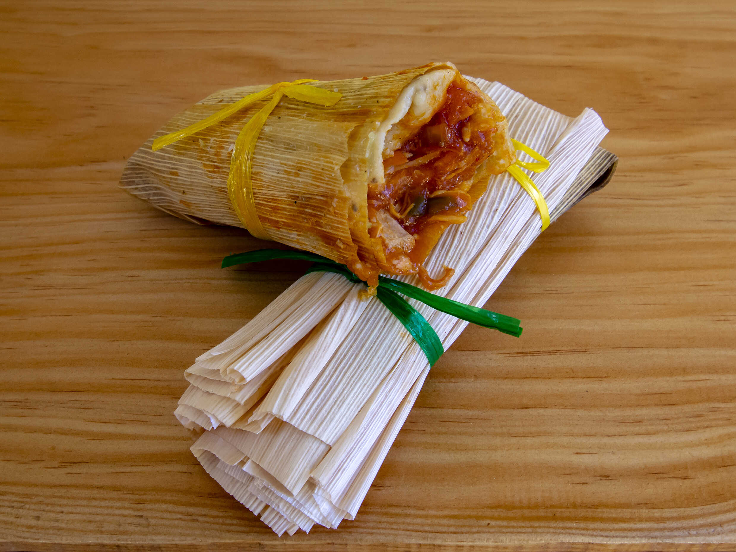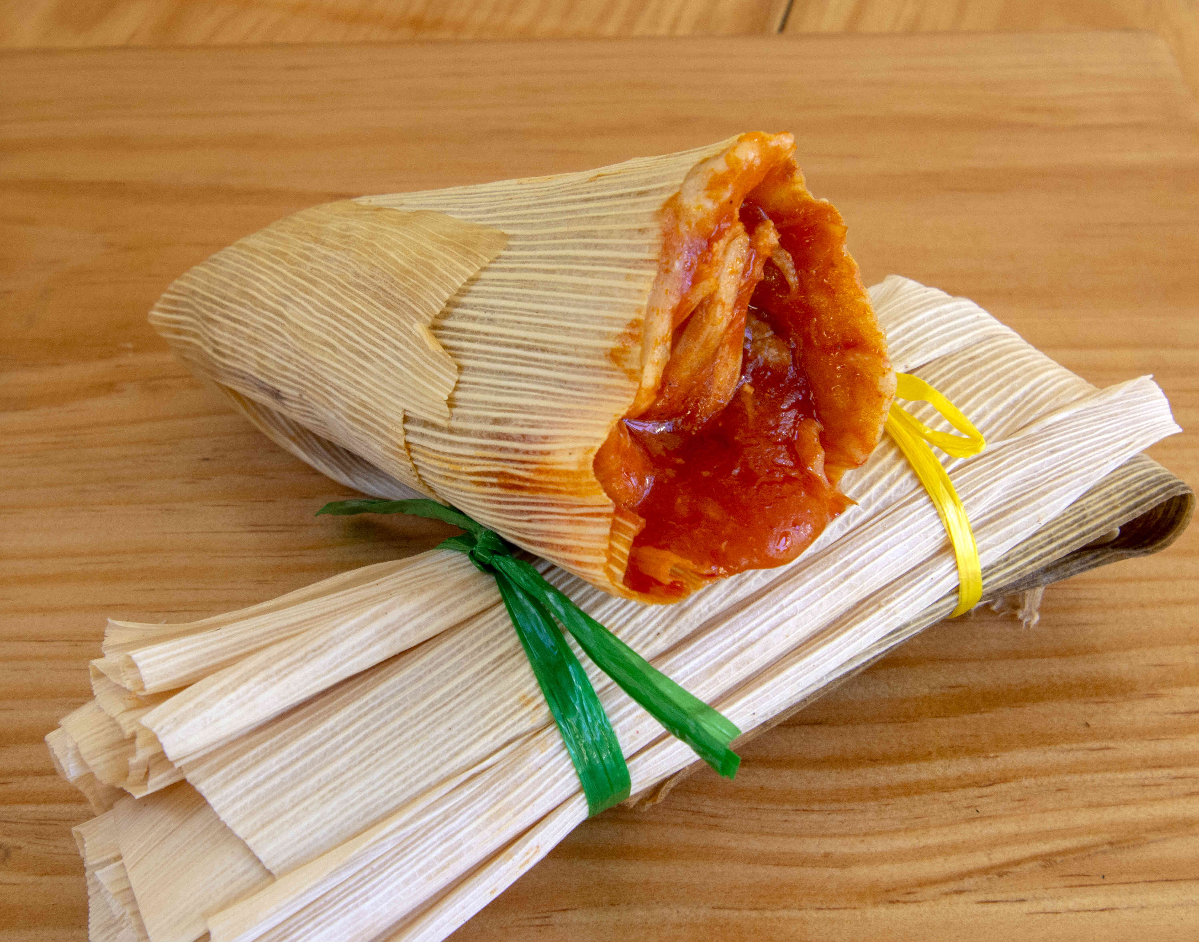 1 Tamal de maíz, con pollo deshebrado y salsa roja.
