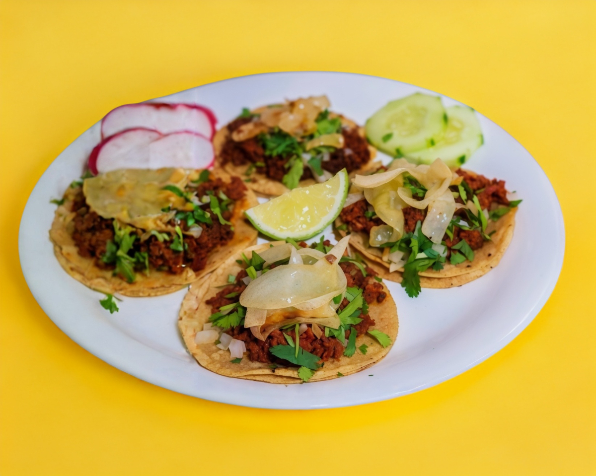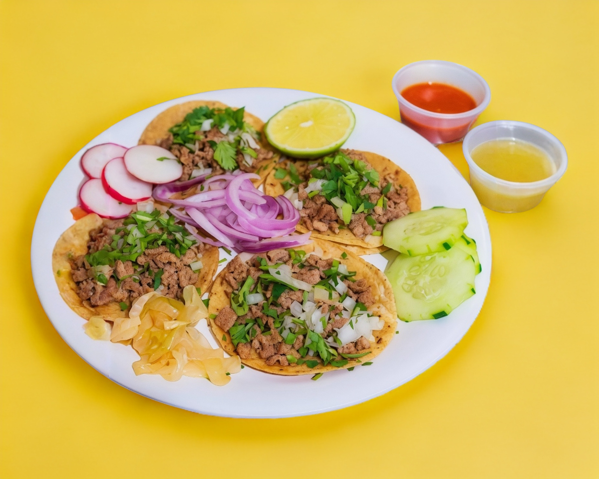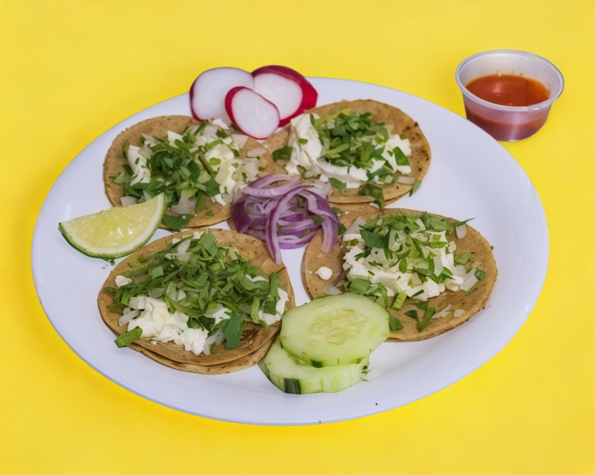 Quesadilla de Maiz en tortilla para taco con Asada 30 gr. acompañada de cebolla, cilantro y repollo.