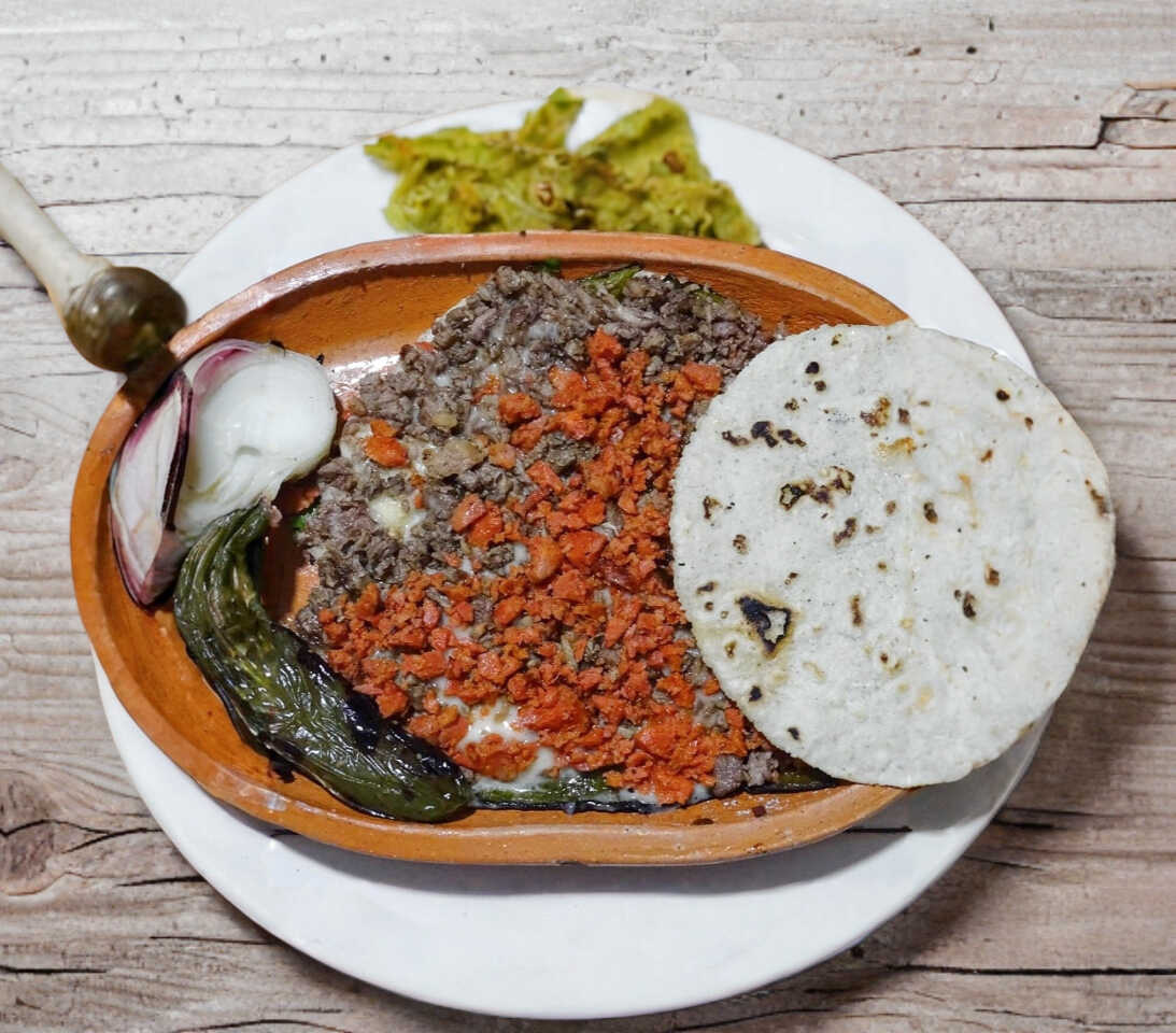 1 Quesadilla con tortilla de harina o maíz, carne a elección (asada, chorizo o combinada), aparte cebolla, cilantro y salsas (guacamole, tomatillo, mexicana y roja)