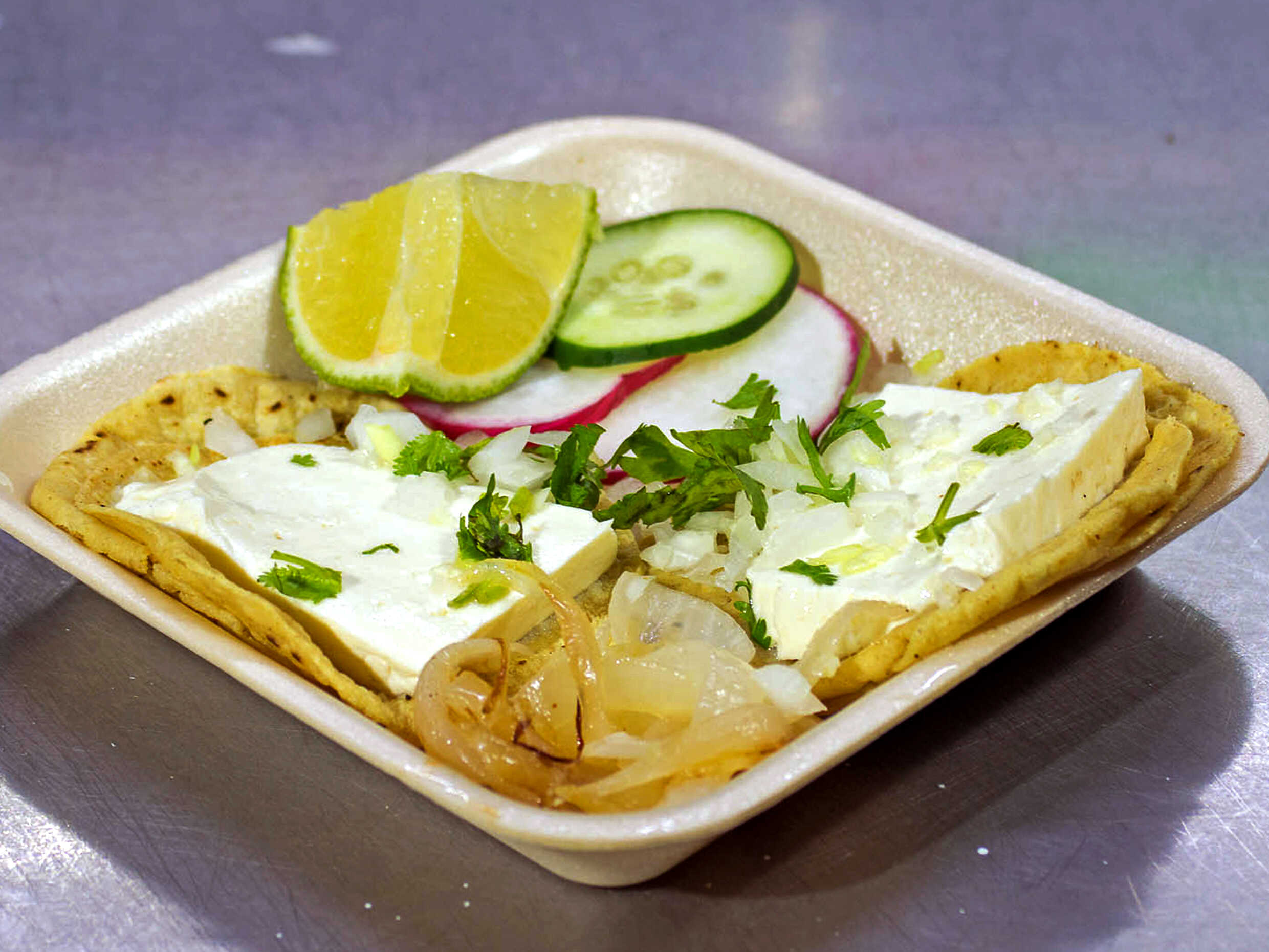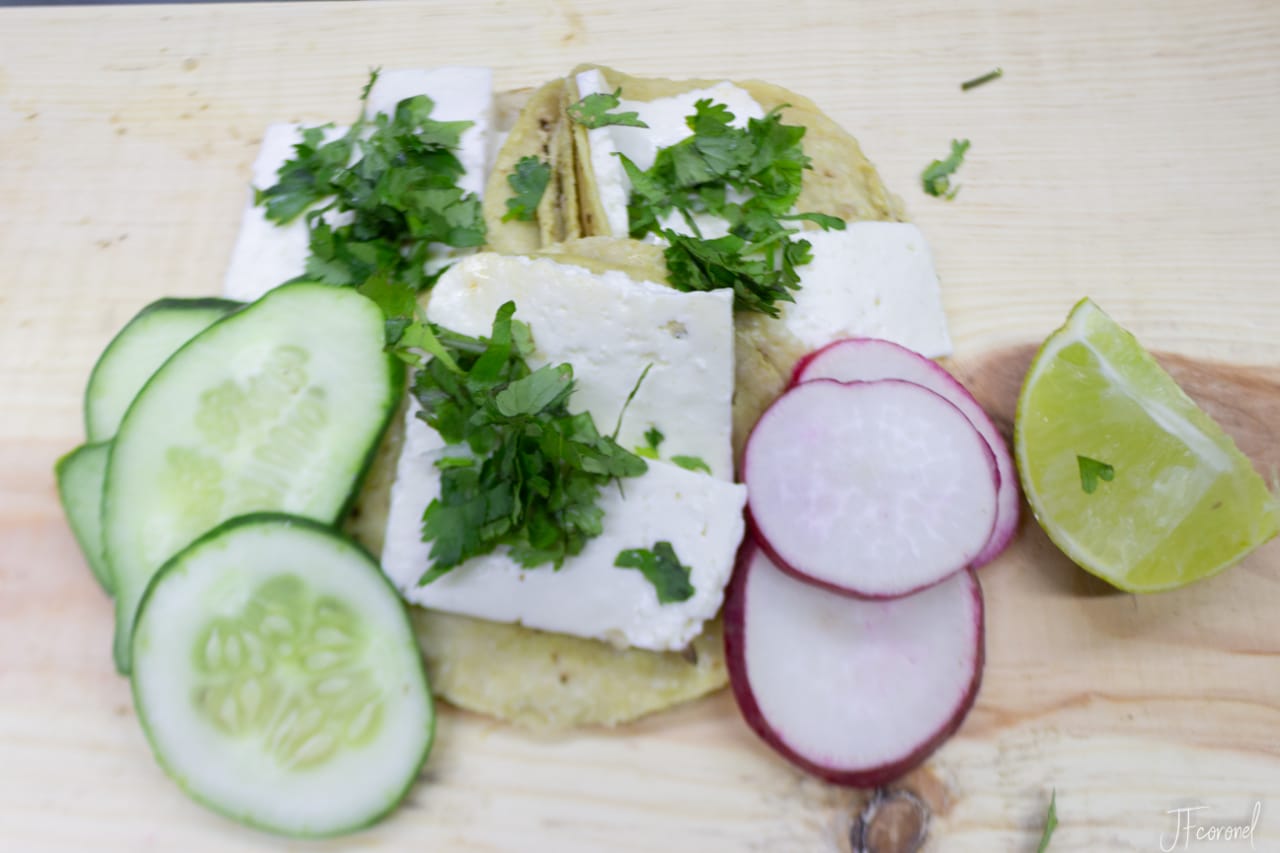 Rico taco de Panela Fundida al comal lleva repollo, cebolla y cilantro