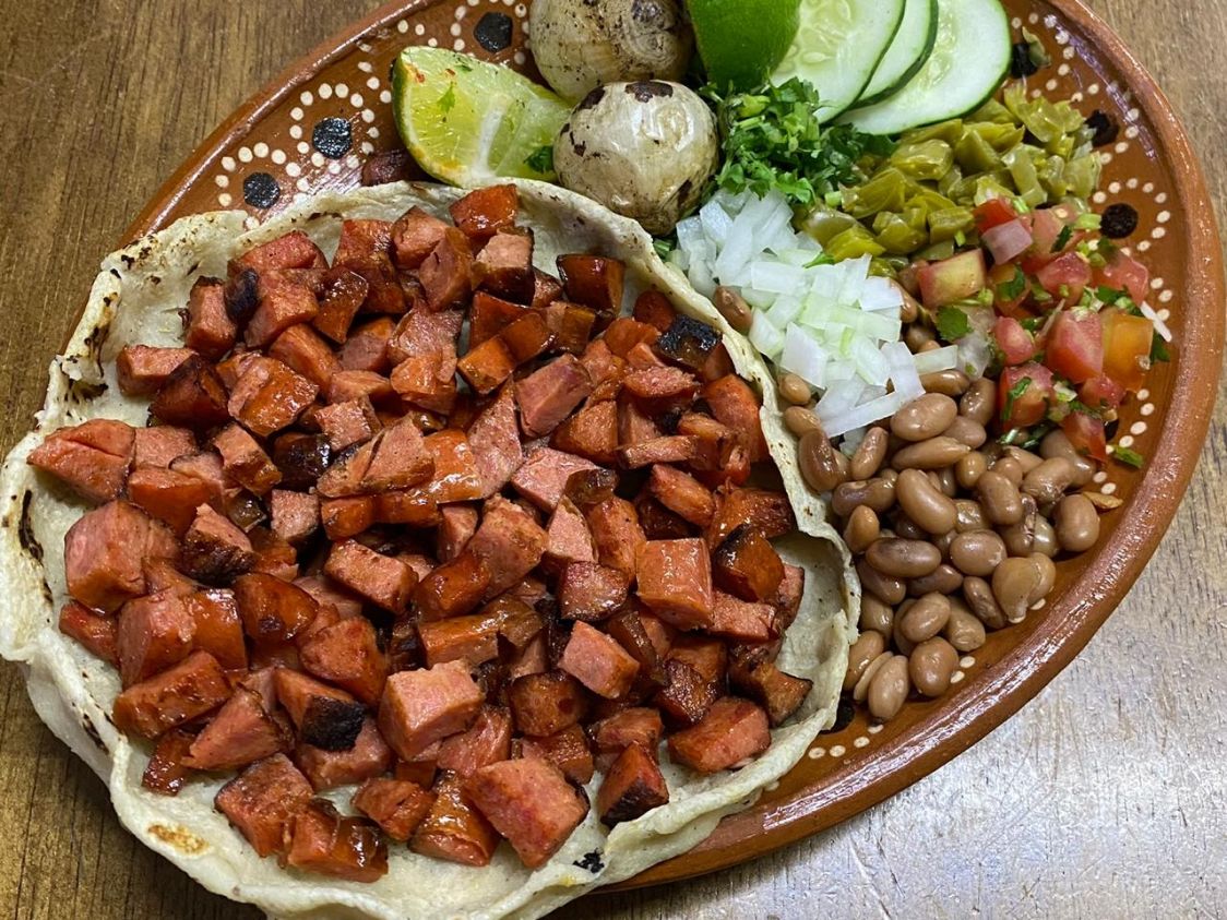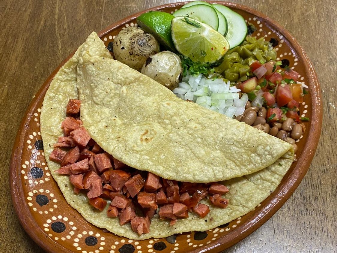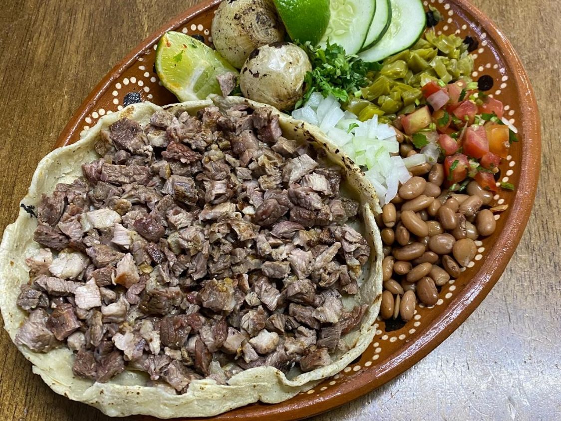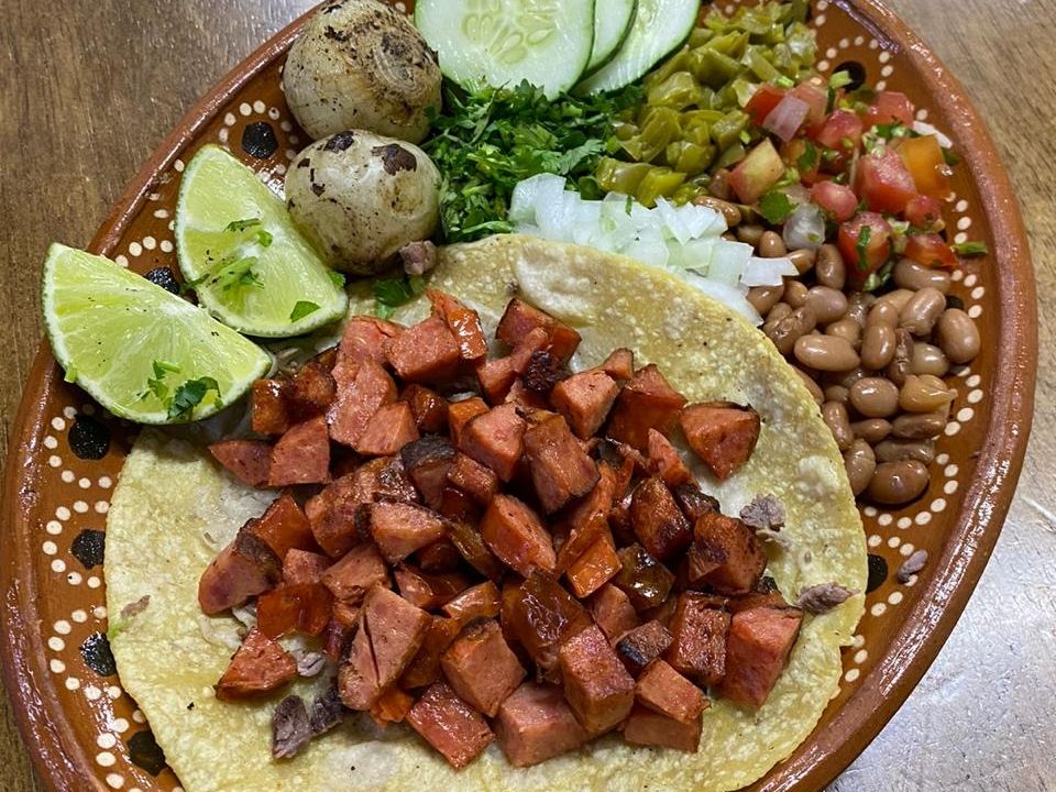 1/4 kg de sirloin, 1 quesadilla chica de maíz, 1 chorizo, 1 chile jalapeño toreado, 1/4 de tortillas, cebollita, frijoles y salsa.