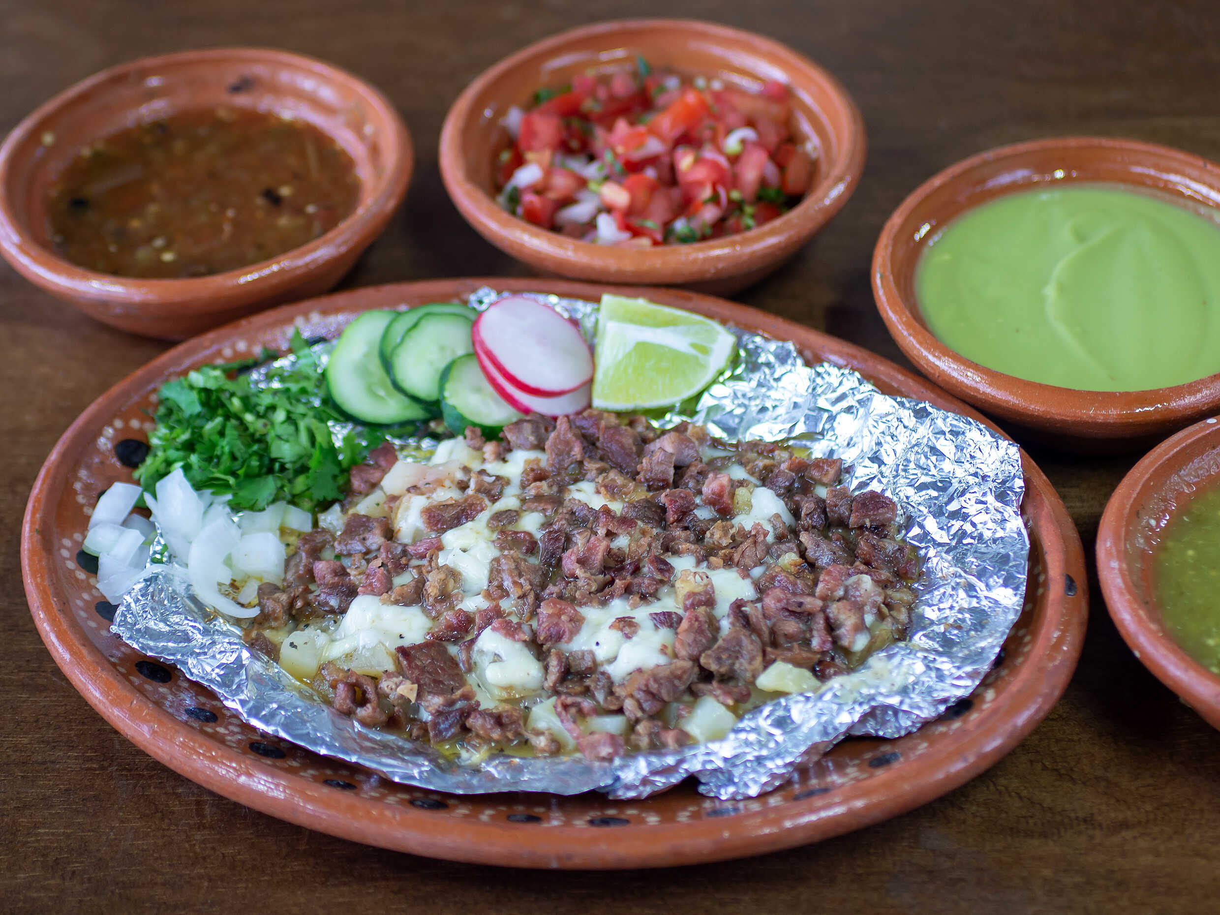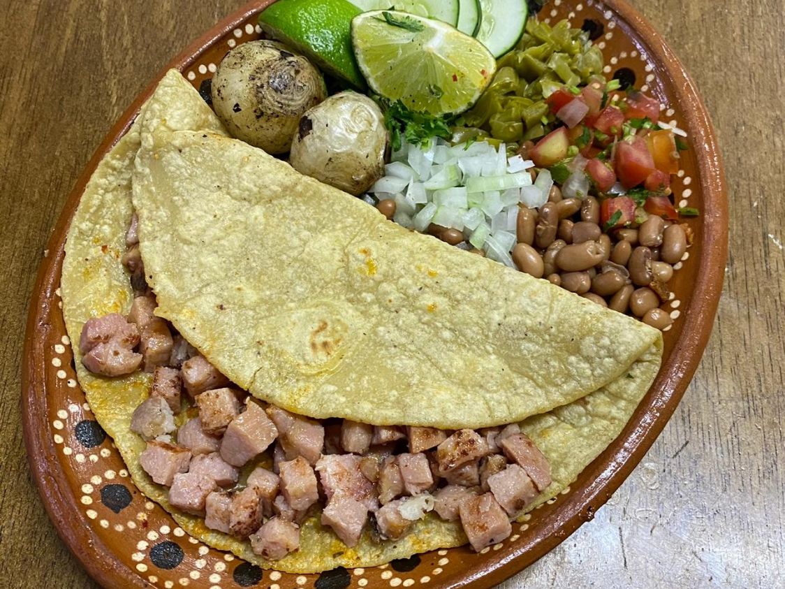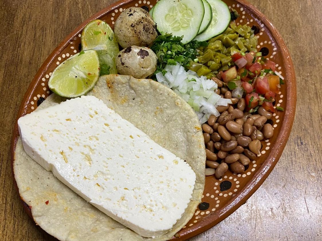 1/4 kg de sirloin, 1 quesadilla chica de maíz, 1 chorizo, 1 chile jalapeño toreado, 1/4 de tortillas, cebollita, frijoles y salsa.