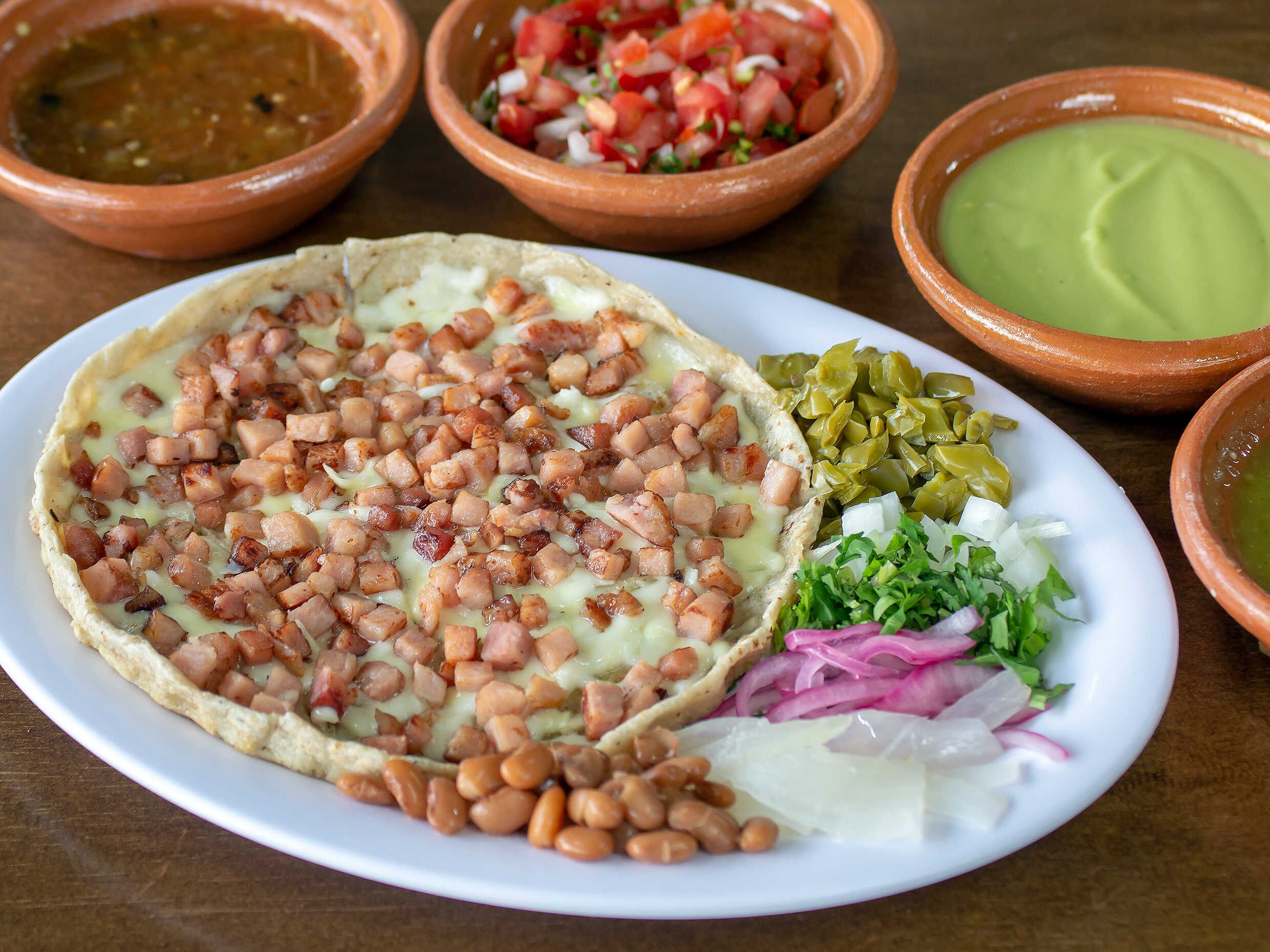Tortilla de harina gigante con queso y chicharrón en salsa roja.