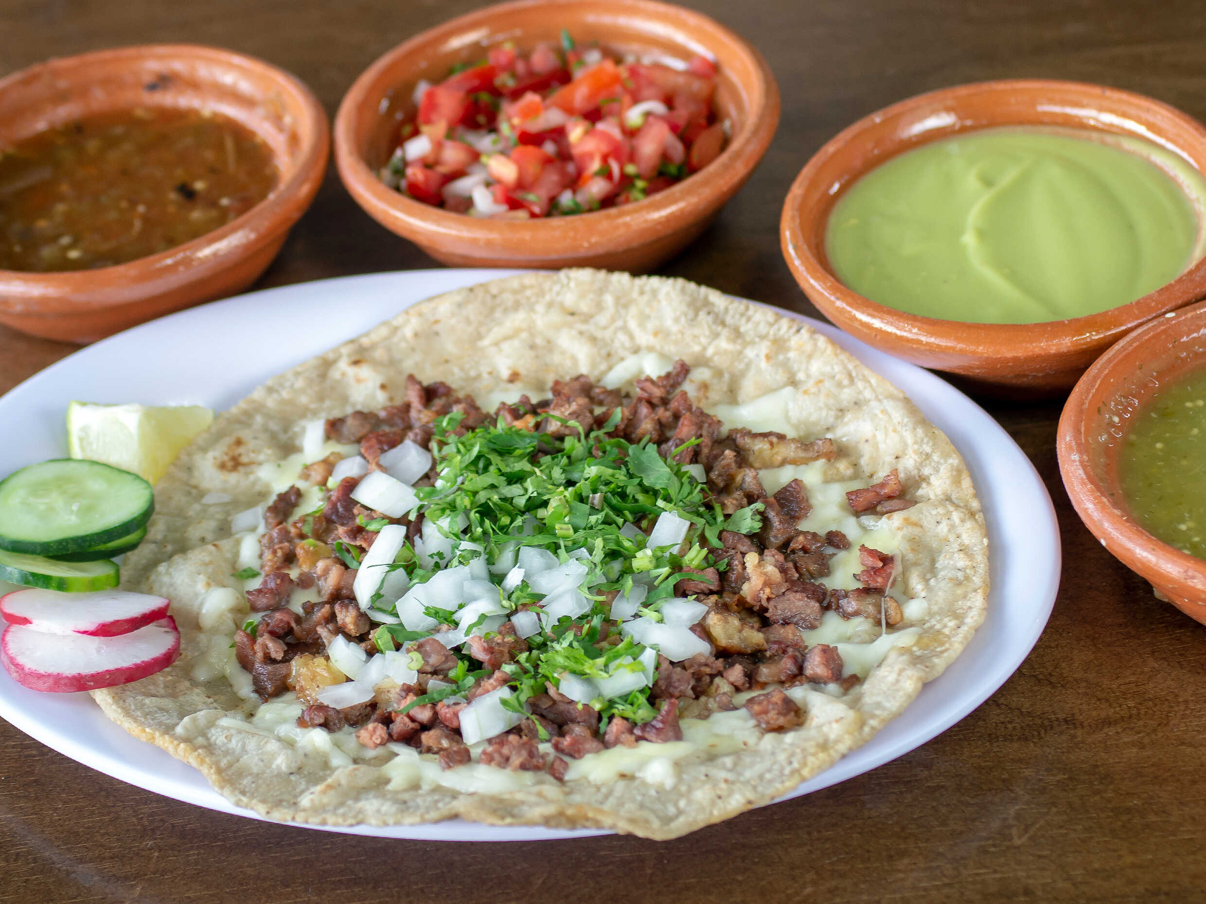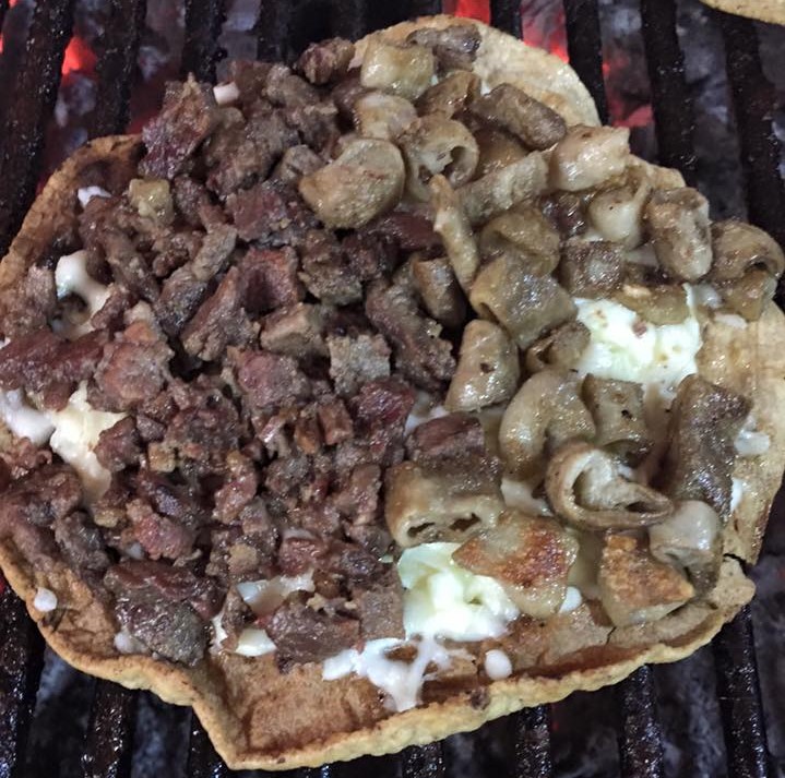 Tortilla grande de maíz con queso y carne asada al carbón.