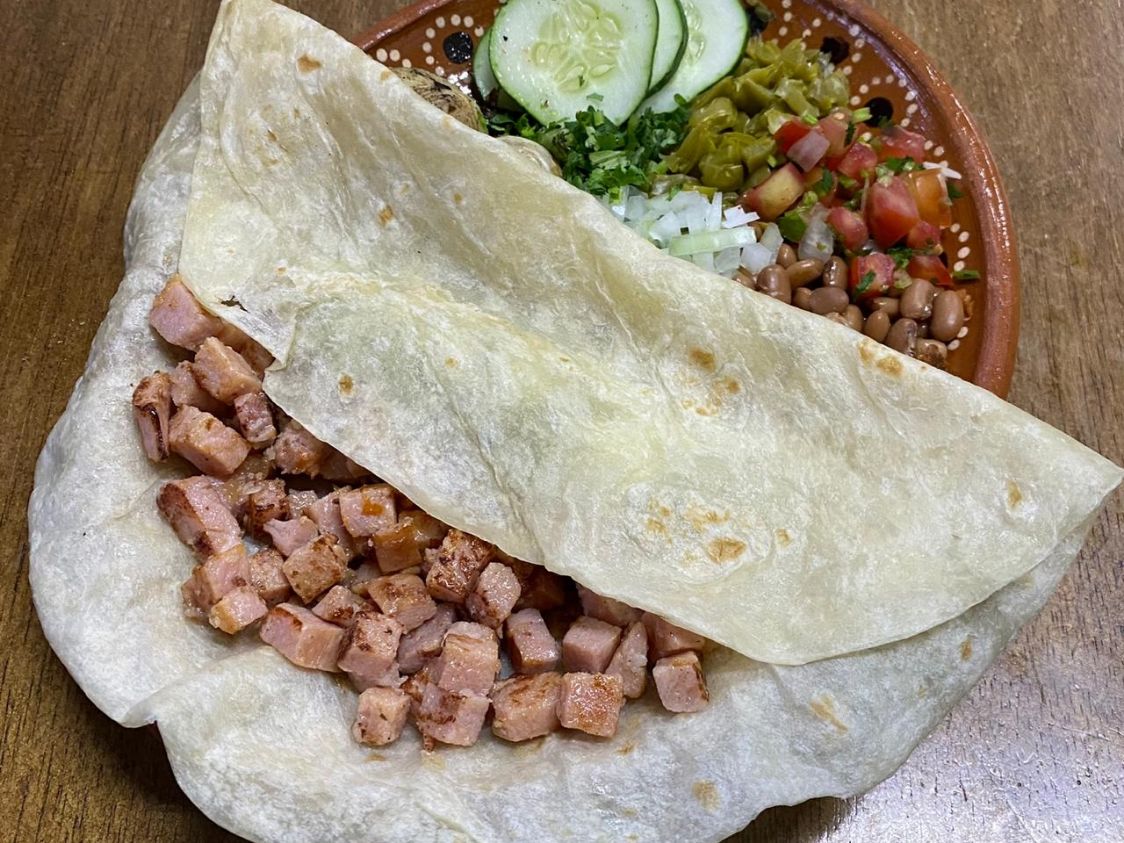 Tortilla grande de maíz con queso y chuleta de cerdo.