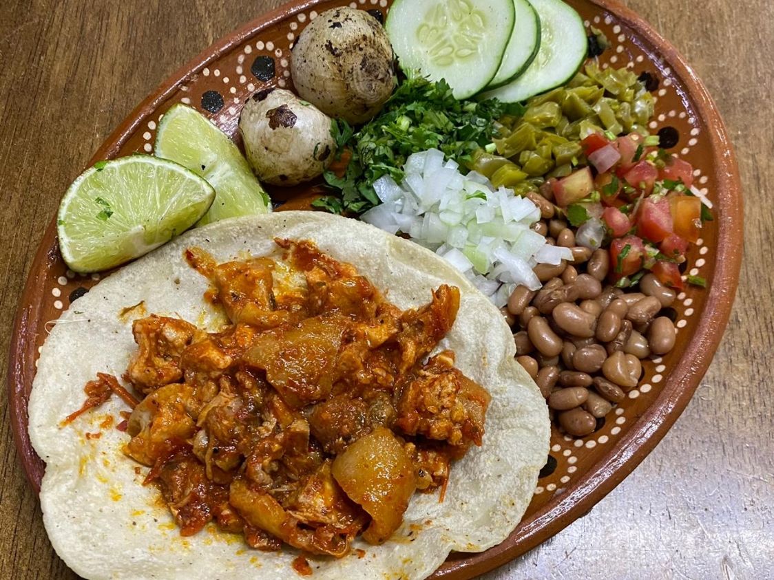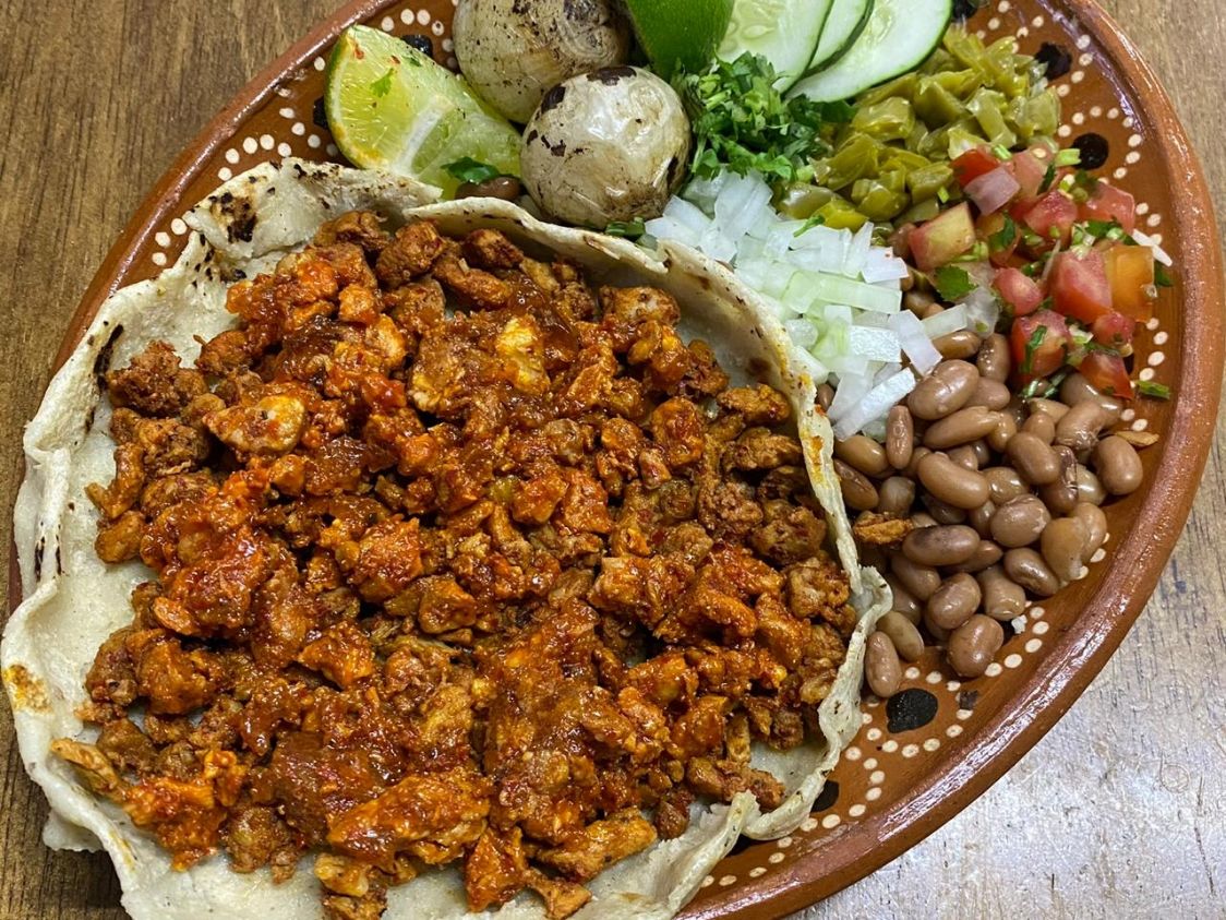 Tortilla de maíz recién hecha con chicharrón en salsa roja.