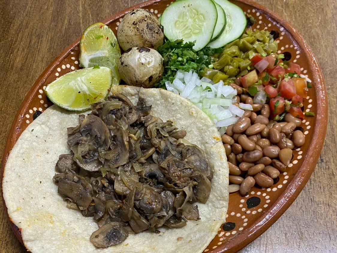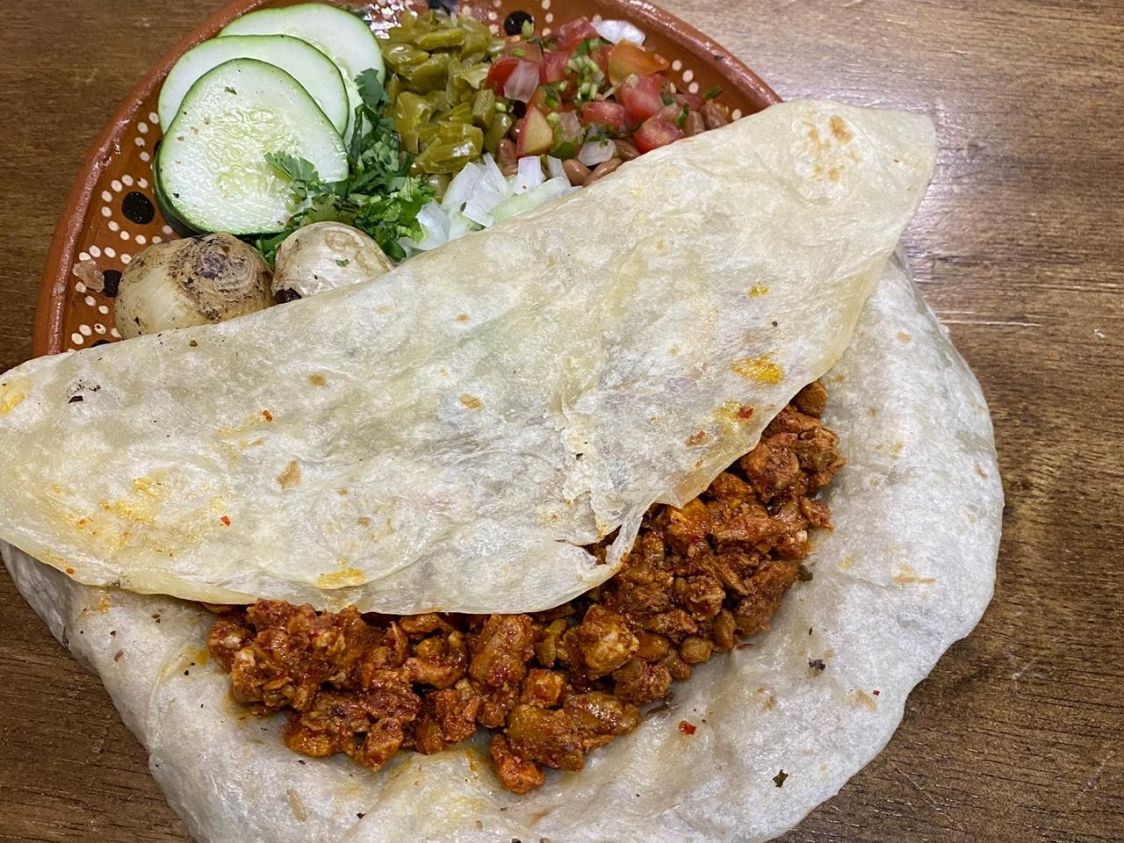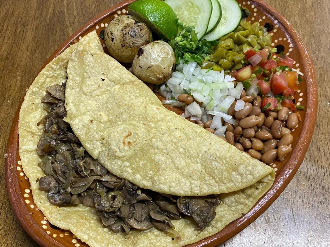 Tortilla grande de maíz con queso y guiso de champiñones (opción vegetariana).