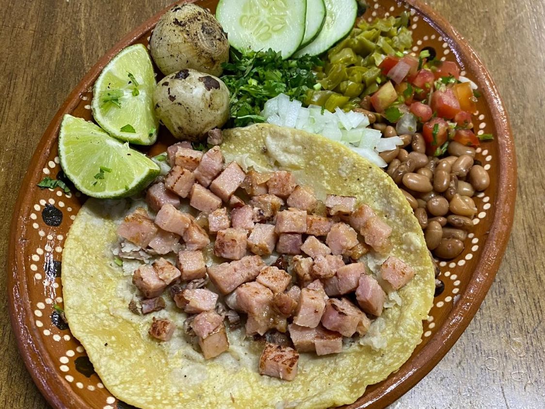 Tortilla de maíz recién hecha con chuleta de cerdo.