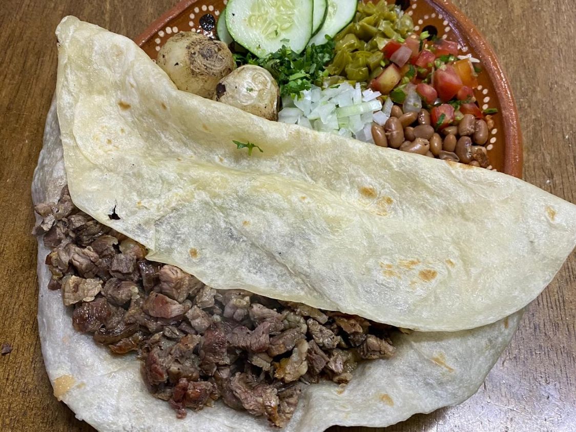 Tortilla de harina gigante con queso y carne asada al carbón.