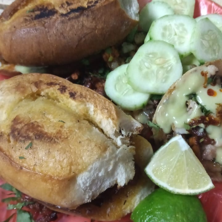 Bolillo doradito de aproximadamente 15 cm, con adobada, cebolla, cilantro y repollo