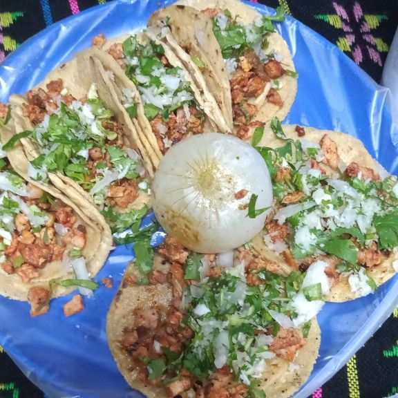 Tortilla de harina, queso manchego, adoba, cebolla, cilantro y repollo.