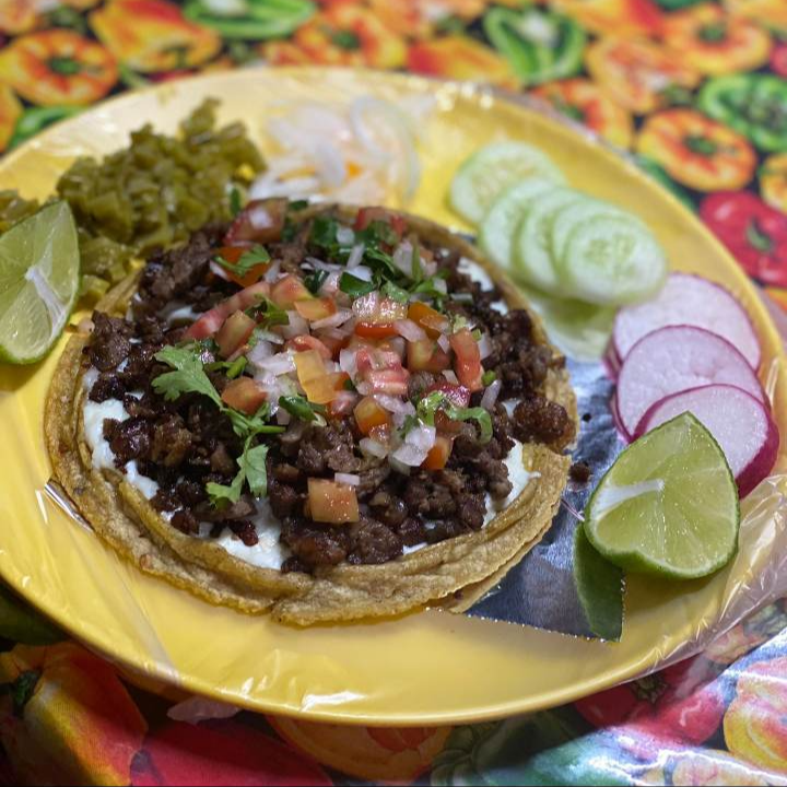 Deliciosa pellizcada de maiz, con queso para derretir, con carne asada al carbon, cebolla, cilantro y repollo, incluye salsas