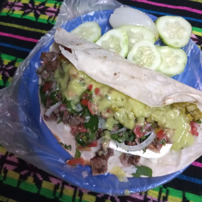 Tortilla de harina, queso manchego carne asada, cebolla, cilantro y repollo.