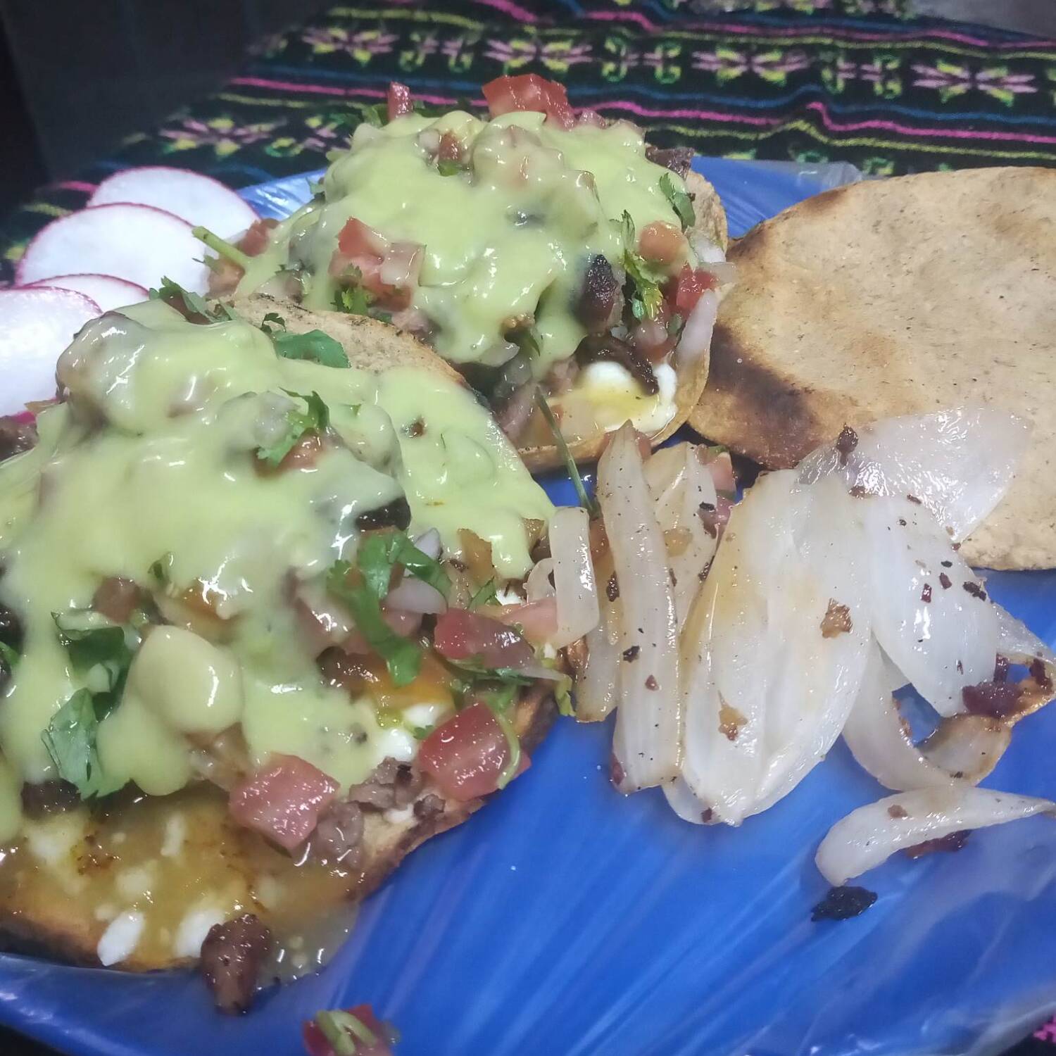 Tortilla dorada de maiz, queso gouda, asada, cebolla, cilantro y repollo