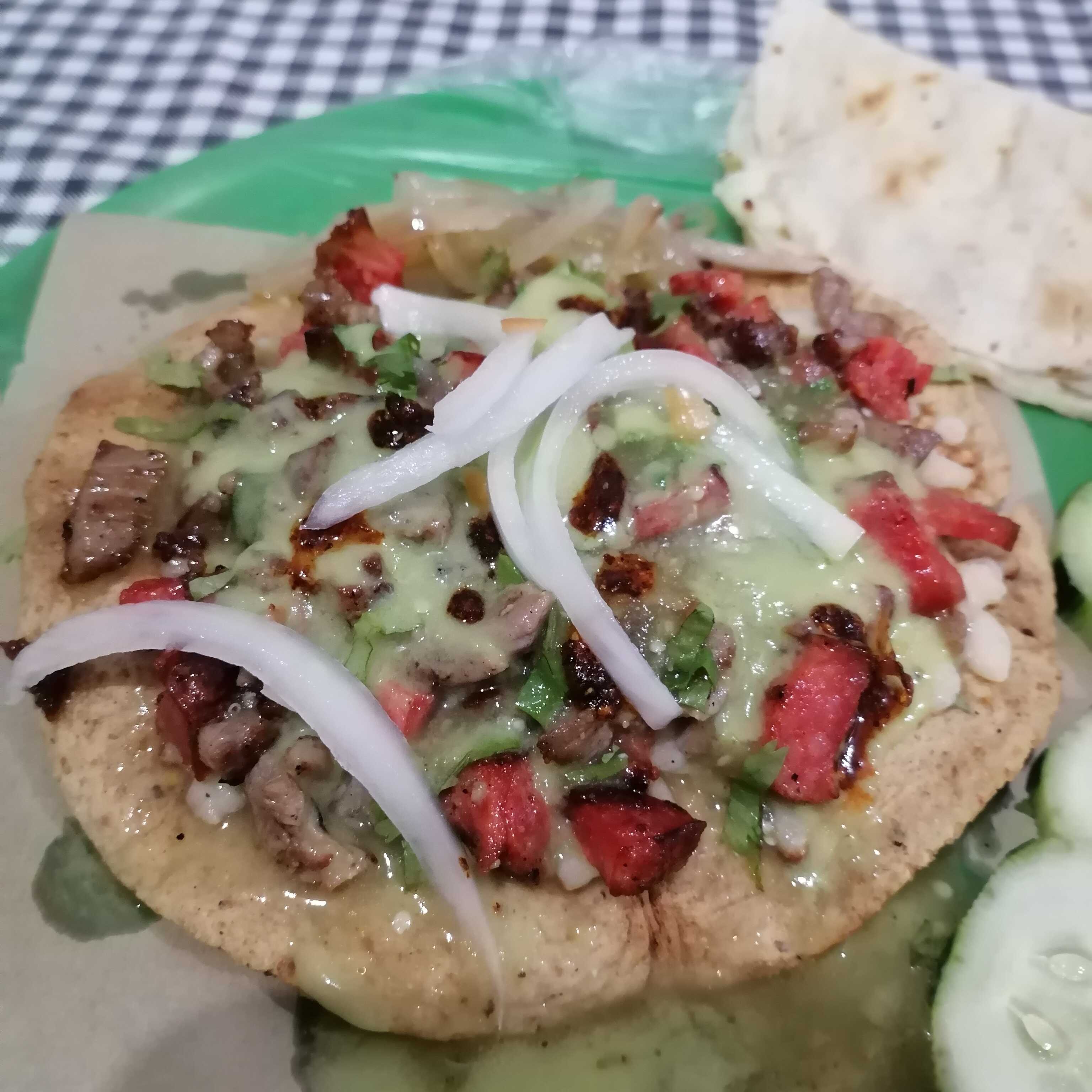 Deliciosa pellizcada de maiz, con queso para derretir, con adobada asada al carbon, cebolla, cilantro y repollo, incluye salsas