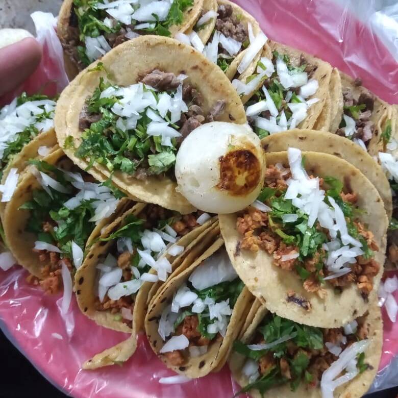 Tacos de tortilla chica en aceite y de carne asada al carbón.