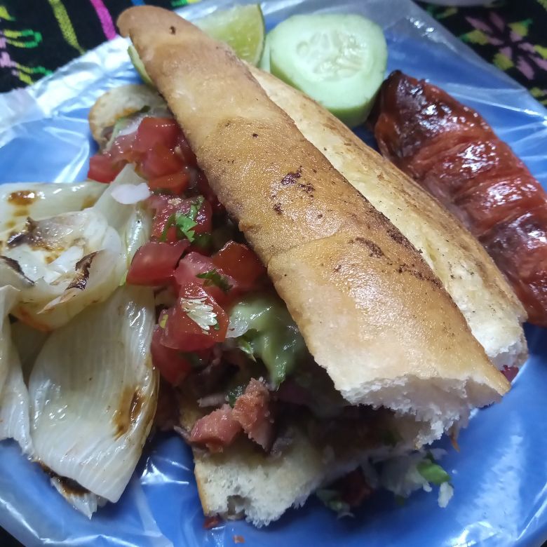 Bolillo doradito de aproximadamente 15 cm, con carne asada y chorizo corona, cebolla, cilantro y repollo.