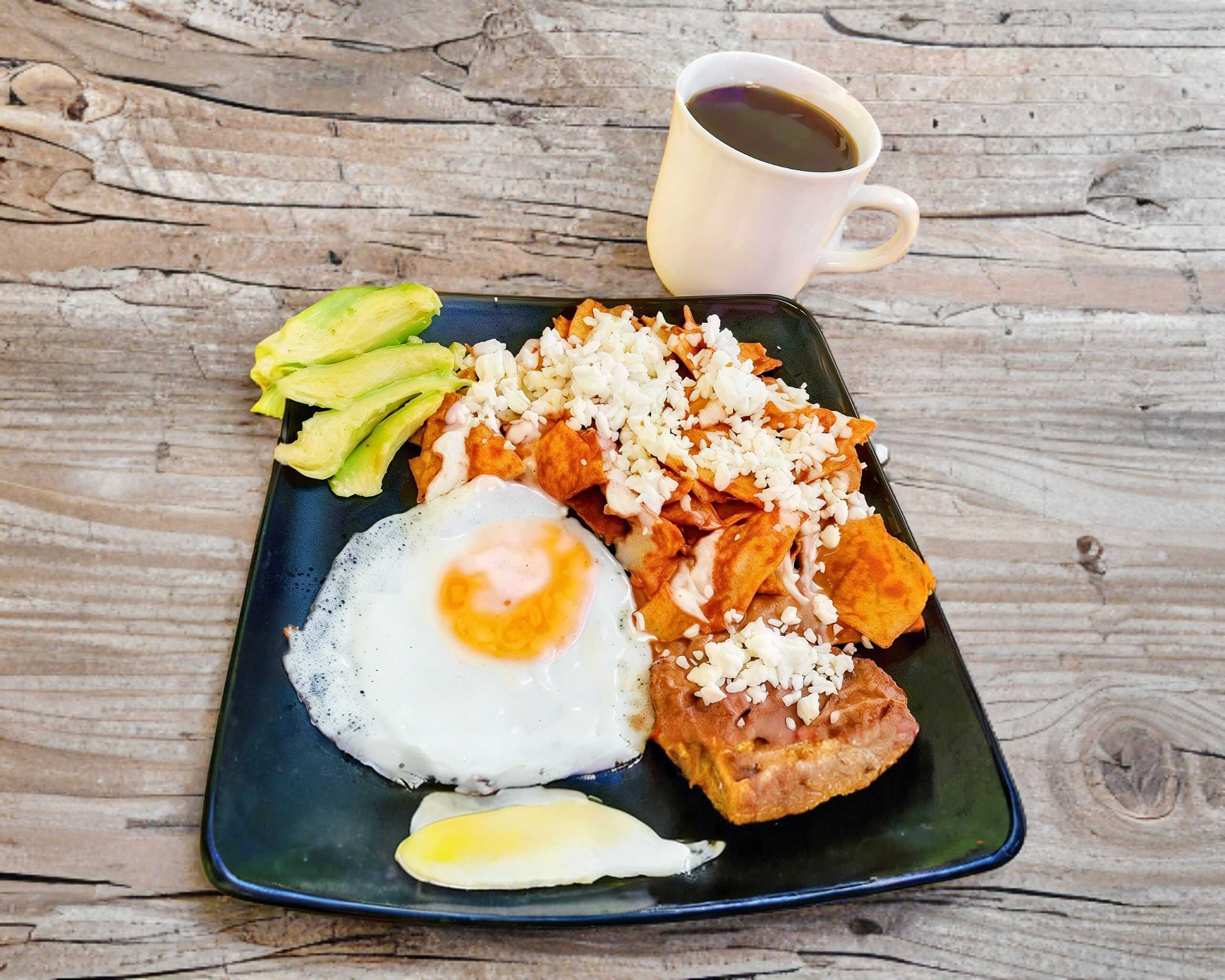 Chilaquiles rojos, acompañados de huevo estrellado, frijolitos con queso y ensalada.