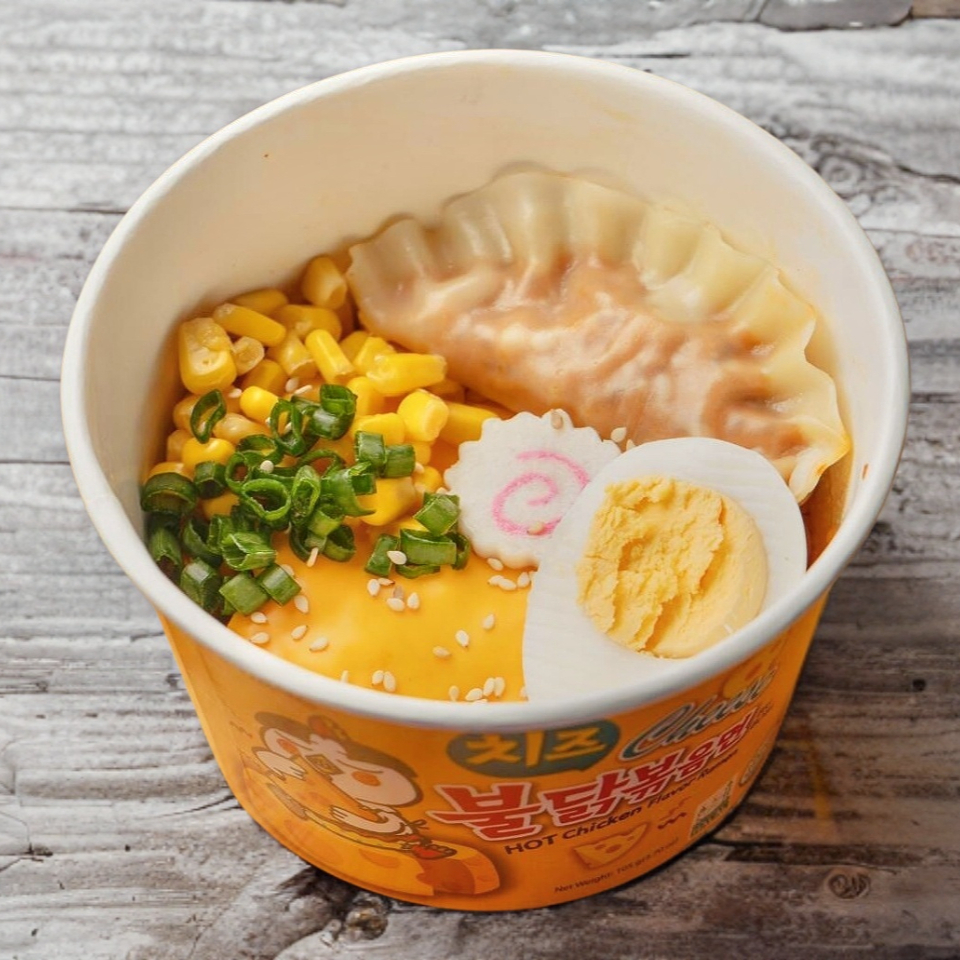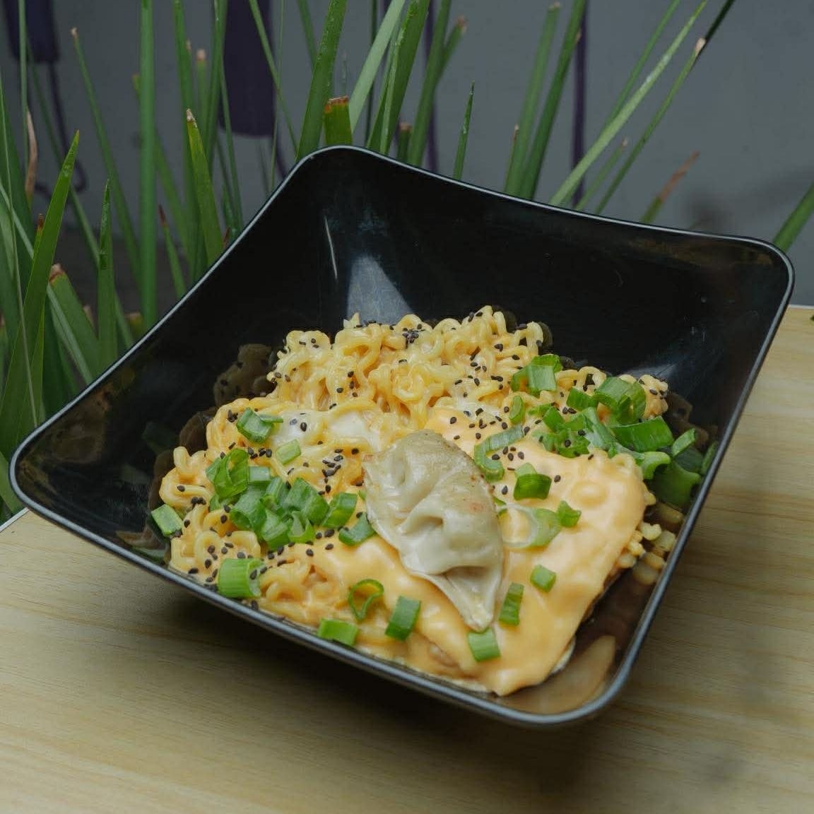 Ramen preparado con mezcla de quesos, incluye un topping a elección, acompañado con cebollín y ajonjoli