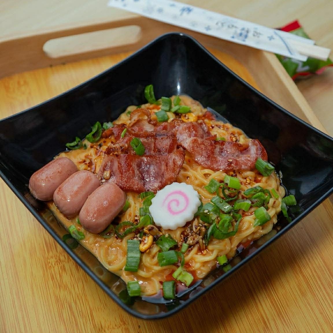 Ramen cremoso spicy preparado con una mezcla de la casa incluye tocino cryspi y una mini brocheta de salchicha doradita
