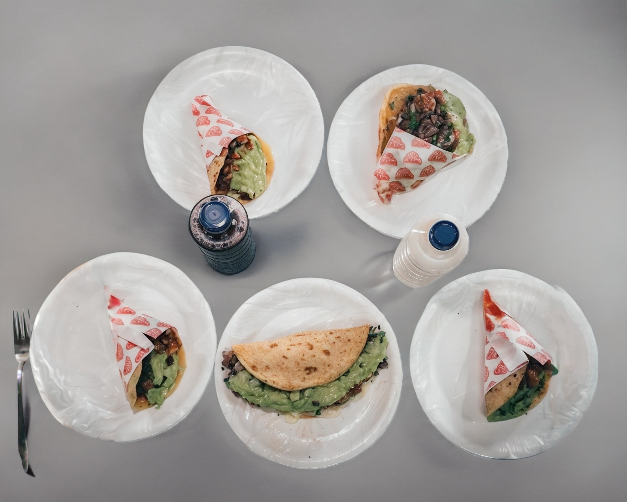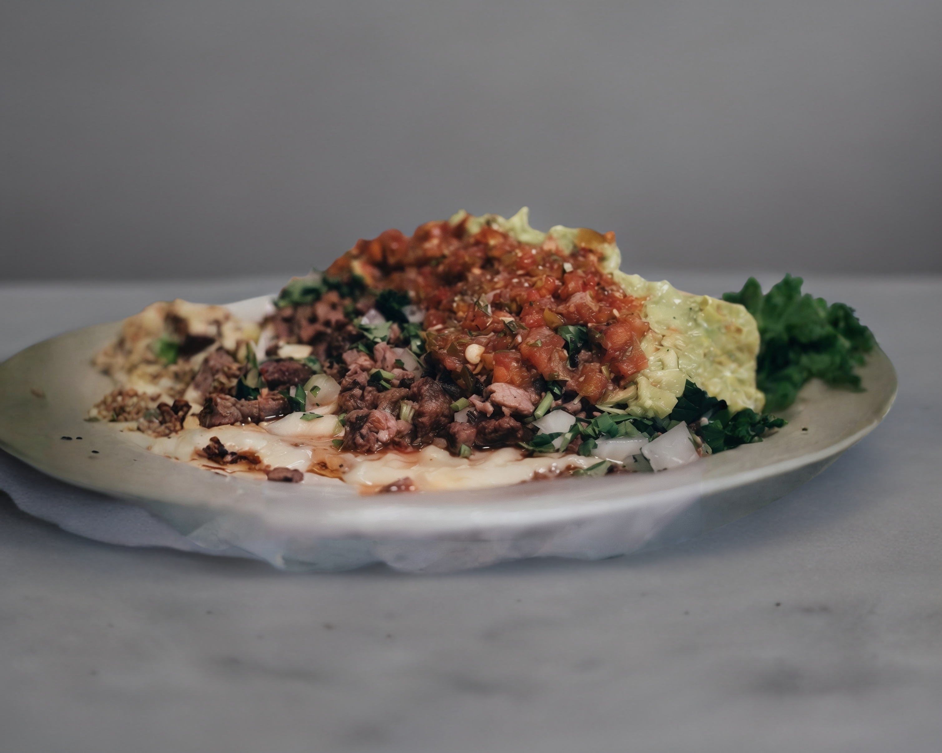 QUESADILLA DE MAIZ CON QUESO CHEDDAR, CARNE ASADA, GUACAMOLE, CEBOLLA, CILANTRO