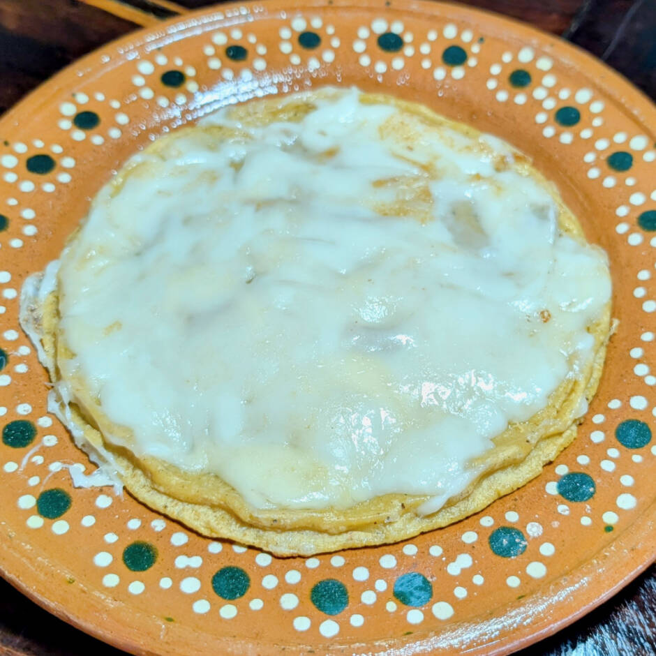 Quesadilla de maíz grande recién hecha con queso derretido.