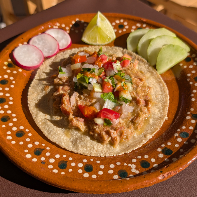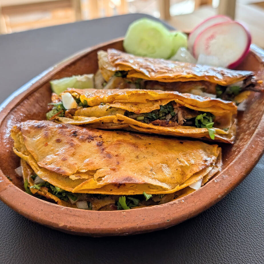 Tacos elaborados con tortilla hecha a mano. Acompañados de salsas y verduras.