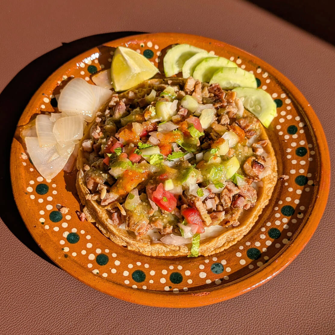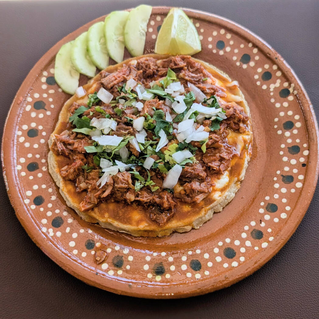 Pellizcada grande recién hecha con dos guisos a elegir y queso derretido.