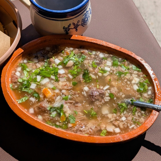 Orden personal con 250gr de cabeza de res, consomé, 5 tortillas, salsas y verduras. 🍲