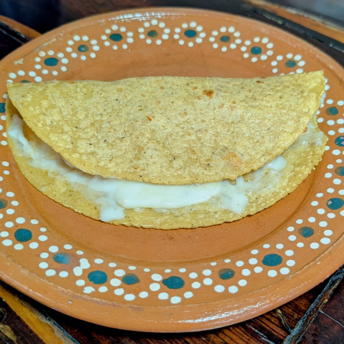 Quesadilla con tortilla de maíz grande recién hecha, dos guisos a elegir y queso derretido. 🌮