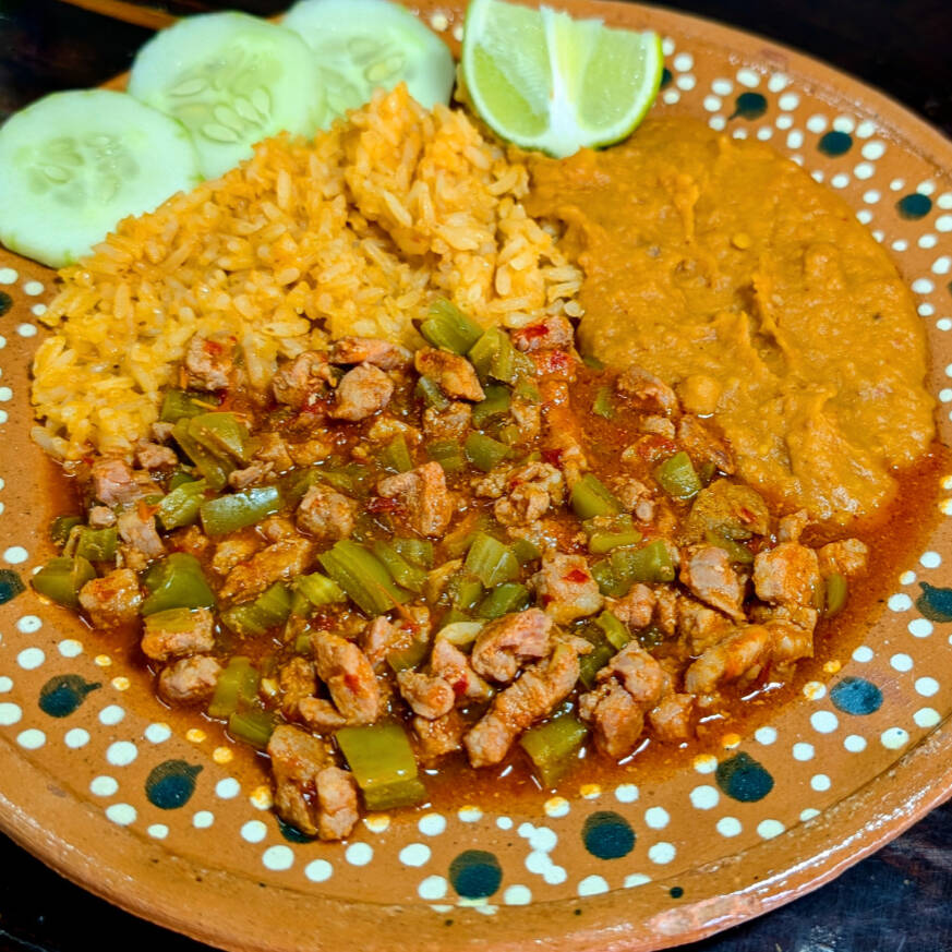 Platillo personal con tres guisos a elegir, frijoles puercos y 5 tortillas. 🍛