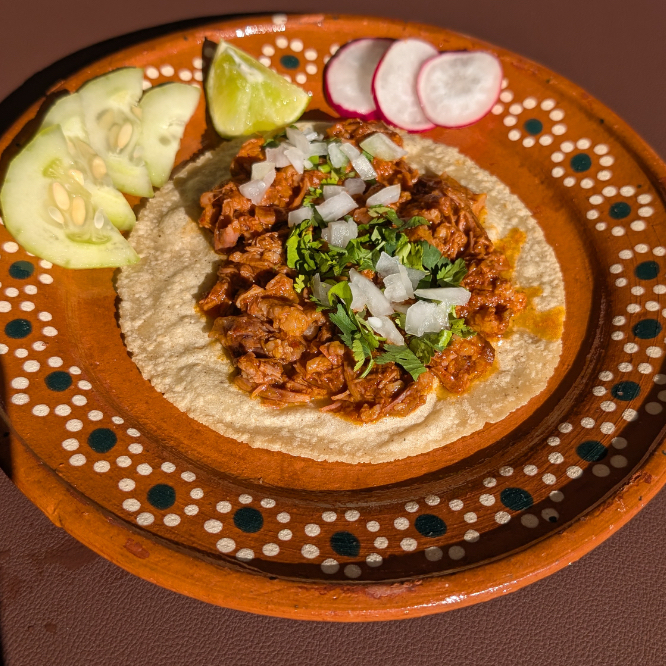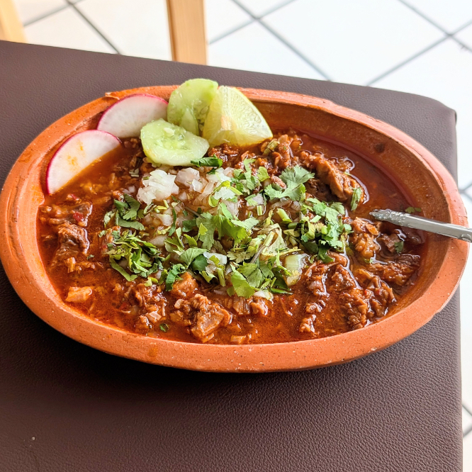 Orden personal con 250gr de birria de res, 5 tortillas hechas a mano, consomé, salsas y verduras. 🍲
